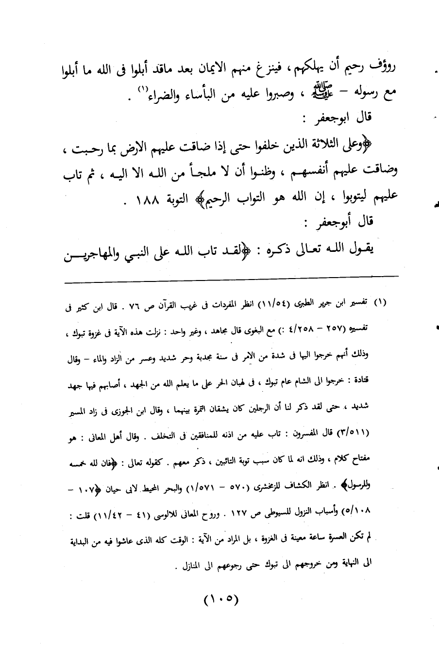 (¬1) تفسير ابن جرير الطبرى (54/ 11) انظر المفردات فى غريب القرآن ص 76. قال ابن كثير فى تفسيره (257 - 258/ 4) مع البغوى قال مجاهد، وغير واحد: نزلت هذه الآية فى غزوة تبوك، وذلك أنهم خرجوا اليها فى شدة من الامر فى سنة مجدبة وحر شديد وعسر من الزاد والماء -وقال قتادة: خرجوا الى الشام عام تبوك، فى لهبان الحر على ما يعلم اللَّه من الجهد، أصابهم فيها جهد شديد، حتى لقد ذكر لنا أن الرجلين كان يشقان التمره بينهما، وقال ابن الجوزى فى زاد المسير (511/ 3) قال المفسرون: تاب عليه من اذنه للمنافقين فى التخلف. وقال أهل المعانى: هو مفتاح كلام، وذلك انه لما كان سبب توبه التائبين، ذكر معهم. كقوله تعالي: {فَأَنَّ لِلَّهِ خُمُسَهُ وَلِلرَّسُولِ}. انظر الكشاف للزمخشرى (570 - 571/ 1) والبحر المحيط لابى حيان (107 - 108/ 5) وأسباب النزول للسيوطى ص 127. وروح المعانى للالوسى (41 - 42/ 11) قلت: لم تكن العسرة ساعة معينة فى الغزوة، بل المراد من الآية: الوقت كله الذى عاشوا فيه من البداية الى النهاية ومن خروجهم الى تبوك حتى رجوعهم الى المنازل.