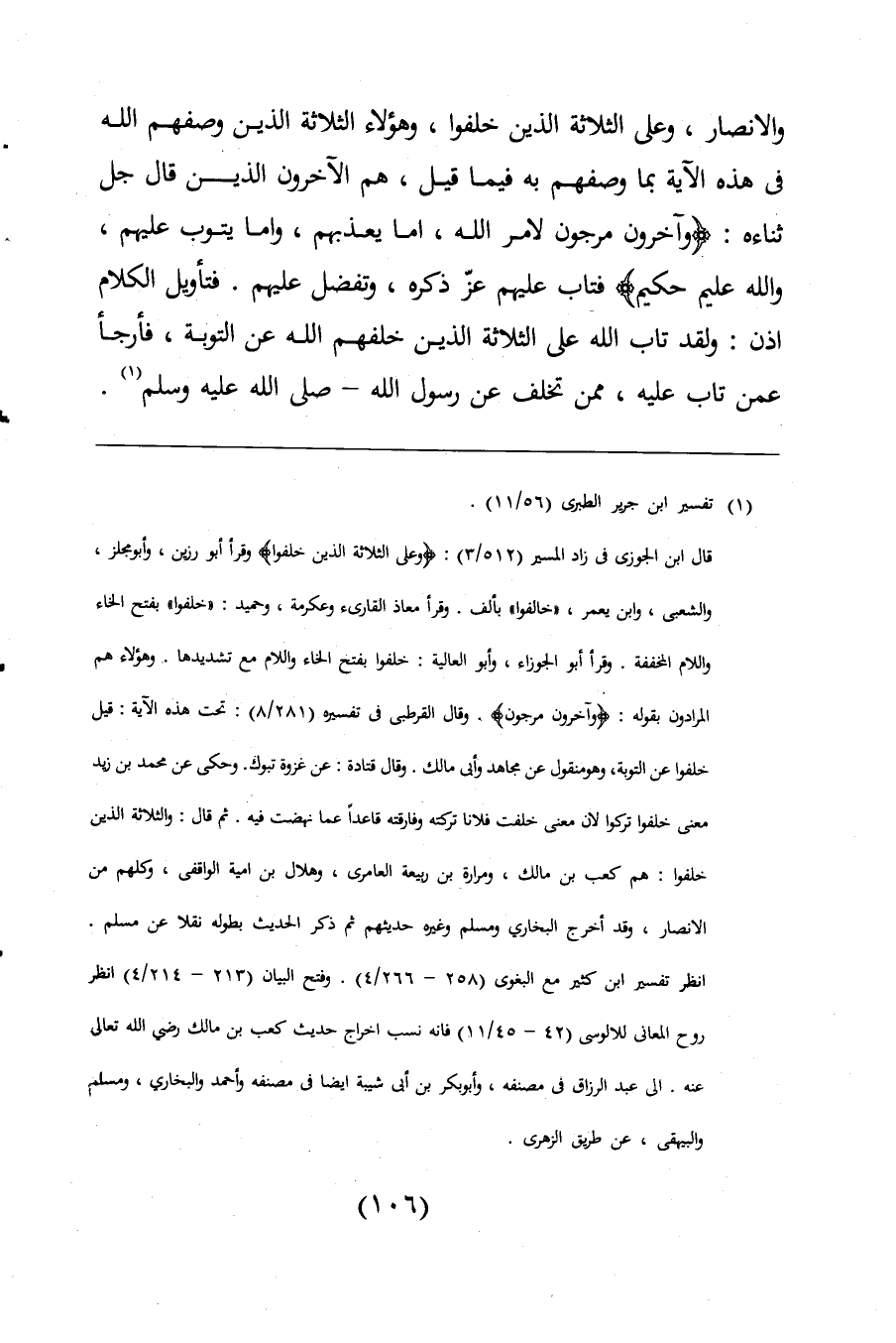 قال ابن الجوزى فى زاد المسير (512/ 3): {وَعَلَى الثَّلَاثَةِ الَّذِينَ خُلِّفُوا} وقرأ أبو رزين، وأبو مجلز، والشعبى، وابن يعمر، "خالفوا" بألف. وقرأ معاذ القارئ وعكرمة، وحميد: "خلفوا" بفتح الخاء واللام المخففة. وقرأ أبو الجوزاء، وأبو العالية: خلفوا بفتح الخاء واللام مع تشديدها. وهؤلاء هم المرادون بقوله: {وَآخَرُونَ مُرْجَوْنَ}، وقال القرطبى فى تفسيره (281/ 8): تحت هذه الآية: قيل خلفوا عن التوبة، وهو منقول عن مجاهد وأبى مالك. وقال قتادة: عن غزوة تبوك. وحكى عن محمد بن زيد معني خلفوا تركوا لان معني خلفت فلانا تركته وفارقته قاعدًا عما نهضت فيه. ثم قال: والثلاثة الذين خلفوا: هم كعب بن مالك، ومرارة بن ربيعه العامرى، وهلال بن امية الواقفى، وكلهم من الانصار، وقد أخرج البخارى ومسلم وغيره حديثهم ثم ذكر الحديث بطوله نقلا عن مسلم. انظر تفسير ابن كثير مع البغوى (258 - 266/ 4). وفتح البيان (213 - 214/ 4) انظر روح المعانى للالوسى (42 - 45/ 11) فانه نسب اخراج حديث كعب بن مالك رضي اللَّه تعالى عنه. الى عبد الرزاق فى مصنفه، وأبو بكر بن أبى شيبة ايضا فى مصنفه وأحمد والبخارى، ومسلم والبيهقى، عن طريق الزهرى.