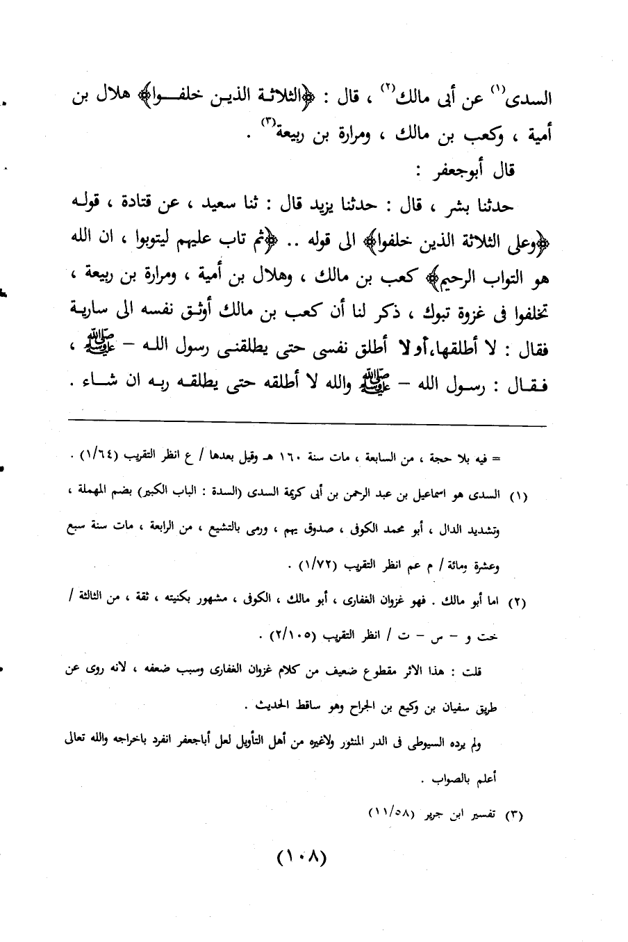حدثنا بشر, قال: حدثنا يزيد قال: ثنا سعيد، عن قتادة، قوله {وَعَلَى الثَّلَاثَةِ الَّذِينَ خُلِّفُوا} الى قوله. . {ثُمَّ تَابَ عَلَيْهِمْ لِيَتُوبُوا إِنَّ اللَّهَ هُوَ التَّوَّابُ الرَّحِيمُ} كعب بن مالك، وهلال بن أمية، ومرارة بن ربيعة, تخلفوا فى غزوة تبوك، ذكر لنا أن كعب بن مالك أوثق نفسه الى سارية فقال: لا أطلقها، أو لا أطلق نفسى حتى يطلقنى رسول اللَّه -صلى اللَّه عليه وسلم-، فقال: رسول اللَّه -صلى اللَّه عليه وسلم- واللَّه لا أطلقه حتى يطلقه ربه ان شاء.