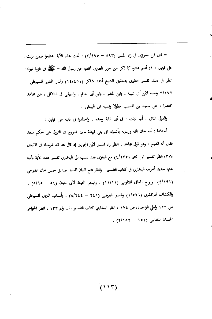 = قال ابن الجوزى فى زاد المسير (493 - 495/ 3): تحت هذه الآية اختلفوا فيمن نزلت على قولين: 1) أنهم عشرة كما ذكر ابن جرير الطبرى تخلفوا عن رسول اللَّه -صلى اللَّه عليه وسلم- فى غزوة تبوك انظر فى ذلك تفسير الطبرى بتحقيق الشيح أحمد شاكر (451/ 14) والدر المنثور للسيوطى 272/ 3 ونسبه لابن أبى شيبة، وابن المنذر، وابن أبى حاتم، والبيهقى فى الدلائل، عن مجاهد مختصرا، عن سعيد بن المسيب مطولا ونسبه الى البيهقى: