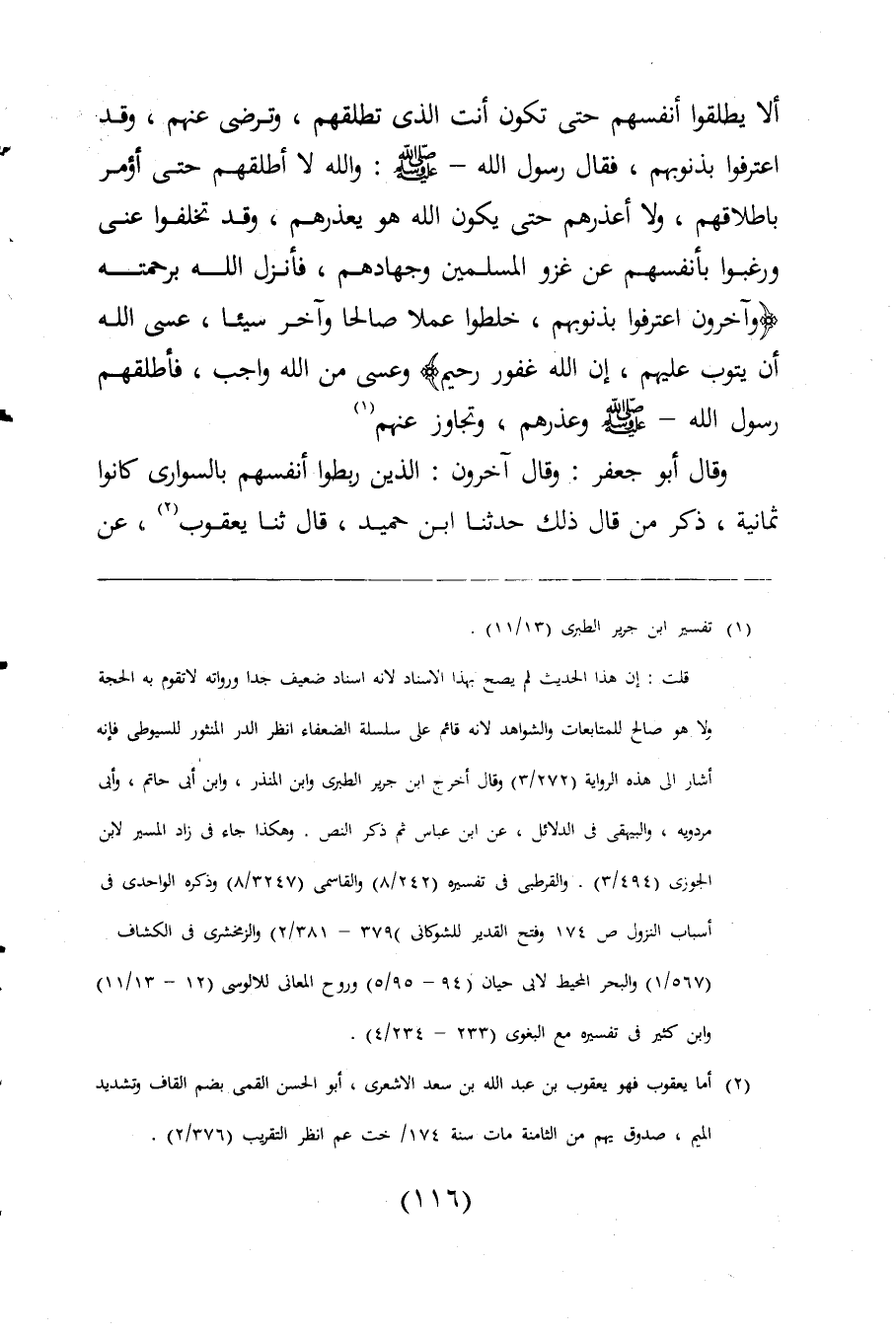 ألا يطلقوا أنفسهم حتى تكون أنت الذى تطلقهم، وترضى عنهم، وقد اعترفوا بذنوبهم، فقال رسول اللَّه -صلى اللَّه عليه وسلم-: واللَّه لا أطلقهم حتى أؤمر باطلاقهم، ولا أعذرهم حتى يكون اللَّه هو يعذرهم، وقد تخلفوا عنى ورغبوا بأنفسهم عن غزو المسلمين وجهادهم، فأنزل اللَّه برحمته {وَآخَرُونَ اعْتَرَفُوا بِذُنُوبِهِمْ خَلَطُوا عَمَلًا صَالِحًا وَآخَرَ سَيِّئًا عَسَى اللَّهُ أَنْ يَتُوبَ عَلَيْهِمْ إِنَّ اللَّهَ غَفُورٌ رَحِيمٌ} وعسى من اللَّه واجب، فأطلقهم رسول اللَّه -صلى اللَّه عليه وسلم- وعذرهم، وتجاوز عنهم. (¬1)