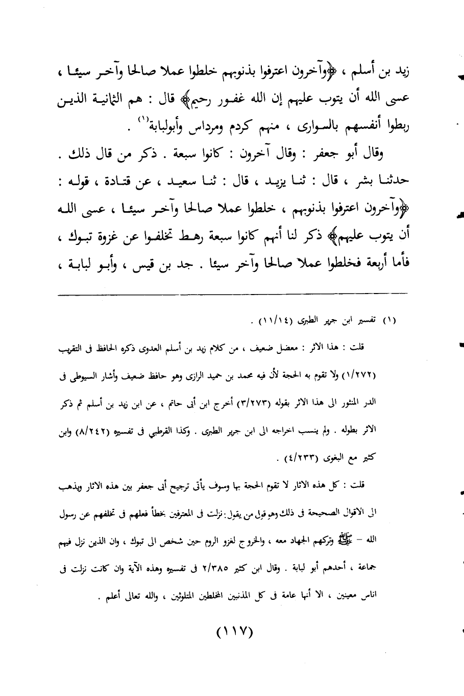 قلت: كل هذه الاثار لا تقوم الحجة بها وسوف يأتى ترجيح أبى جعفر بين هذه الاثار ويذهب الى الاقوال الصحيحة فى ذلك، وهو قول من نزلت فى المعترفين بخطأ فعلهم فى تخلفهم عن رسول اللَّه -صلى اللَّه عليه وسلم- وتركهم الجهاد معه، والخروج لغزو الروم حين شخص الى تبوك، وان الذين نزل فيهم جماعة، أحدهم أبو لبابة. وقال ابن كثير 385/ 2 فى تفسيره وهذه الآية وان كانت نزلت فى اناس معينين، الا أنها عامة فى كل المذنبين المخلطين المتلوثين، واللَّه تعالى أعلم.