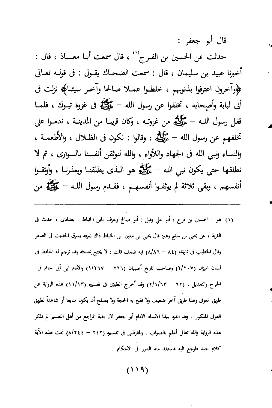 حدثت عن الحسين بن الفرج (¬1)، قال سمعت أبا معاذ، قال: أخبرنا عبيد بن سليمان، قال: سمعت الضحاك يقول: فى قوله تعالى {وَآخَرُونَ اعْتَرَفُوا بِذُنُوبِهِمْ خَلَطُوا عَمَلًا صَالِحًا وَآخَرَ سَيِّئًا} نزلت فى أبى لبابة وأصحابه، تخلفوا عن رسول اللَّه -صلى اللَّه عليه وسلم- فى غزوة تبوك، فلما قفل رسول اللَّه -صلى اللَّه عليه وسلم- من غزوته، وكان قريبا من المدينة، ندموا على تخلفهم عن رسول اللَّه -صلى اللَّه عليه وسلم-، وقالوا: نكون فى الظلال، والأطعمة، والنساء ونبى اللَّه فى الجهاد واللأواء، واللَّه لنوثقن أنفسنا بالسوارى، ثم لا نطلقها حتى يكون نبي اللَّه -صلى اللَّه عليه وسلم- هو الذى يطلقنا ويعذرنا، وأوثقوا أنفسهم، وبقى ثلاثة لم يوثقوا أنفسهم، فقدم رسول اللَّه -صلى اللَّه عليه وسلم- من