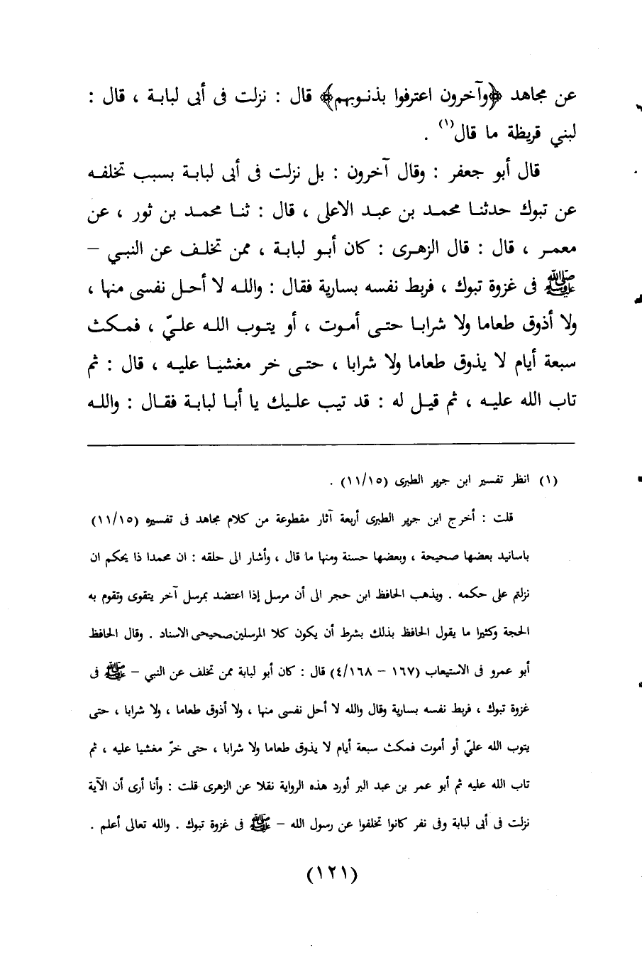 قلت: أخرج ابن جرير الطبرى أربعة آثار مقطوعة من كلام مجاهد فى تفسيره (15/ 11) باسانيد بعضها صحيحة، وبعضها حسنة ومنها ما قال، وأشار الى حلقه: ان محمدا ذا يحكم ان نزلتم على حكمه. ويذهب الحافظ ابن حجر الى أن مرسل إذا اعتضد بمرسل آخر يتقوى وتقوم به الحجة وكثيرا ما يقول الحافظ بذلك بشرط أن يكون كلا المرسلين صحيحى الاسناد. وقال الحافظ أبو عمرو فى الاستيعاب (167 - 168/ 4) قال: كان أبو لبابة ممن تخلف عن النبي -صلى اللَّه عليه وسلم - فى غزوة تبوك، فربط نفسه بسارية وقال واللَّه لا أحل نفسى منها، ولا أذوق طعاما، ولا شرابا، حتى يتوب اللَّه عليّ أو أموت فمكث سبعة أيام لا يذوق طعاما ولا شرابا، حتى خر مغشيا عليه، ثم تاب اللَّه عليه ثم أبو عمر بن عبد البر أورد هذه الرواية نقلا عن الزهرى. قلت: وأنا أرى أن الآية نزلت فى أبى لبابة وفى نفر كانوا تخلفوا عن رسول اللَّه -صلى اللَّه عليه وسلم- فى غزوة تبوك. واللَّه تعالى أعلم.