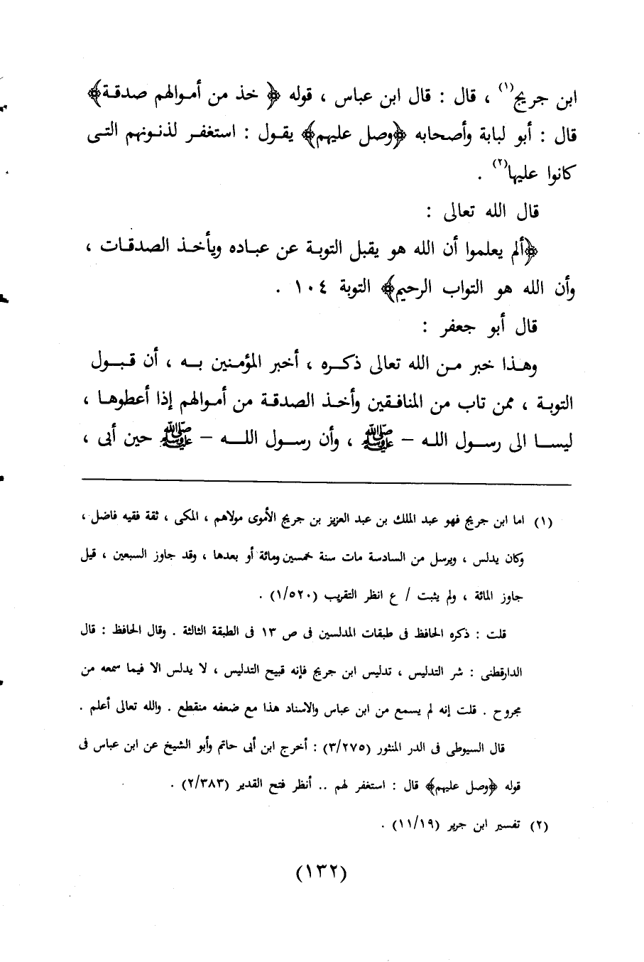 ابن جريج (¬1)، قال: قال ابن عباس، قوله {خُذْ مِنْ أَمْوَالِهِمْ صَدَقَةً} قال: أبو لبابة وأصحابه {وَصَلِّ عَلَيْهِمْ} يقول: استغفر لذنونهم التى كانوا عليها (¬2).