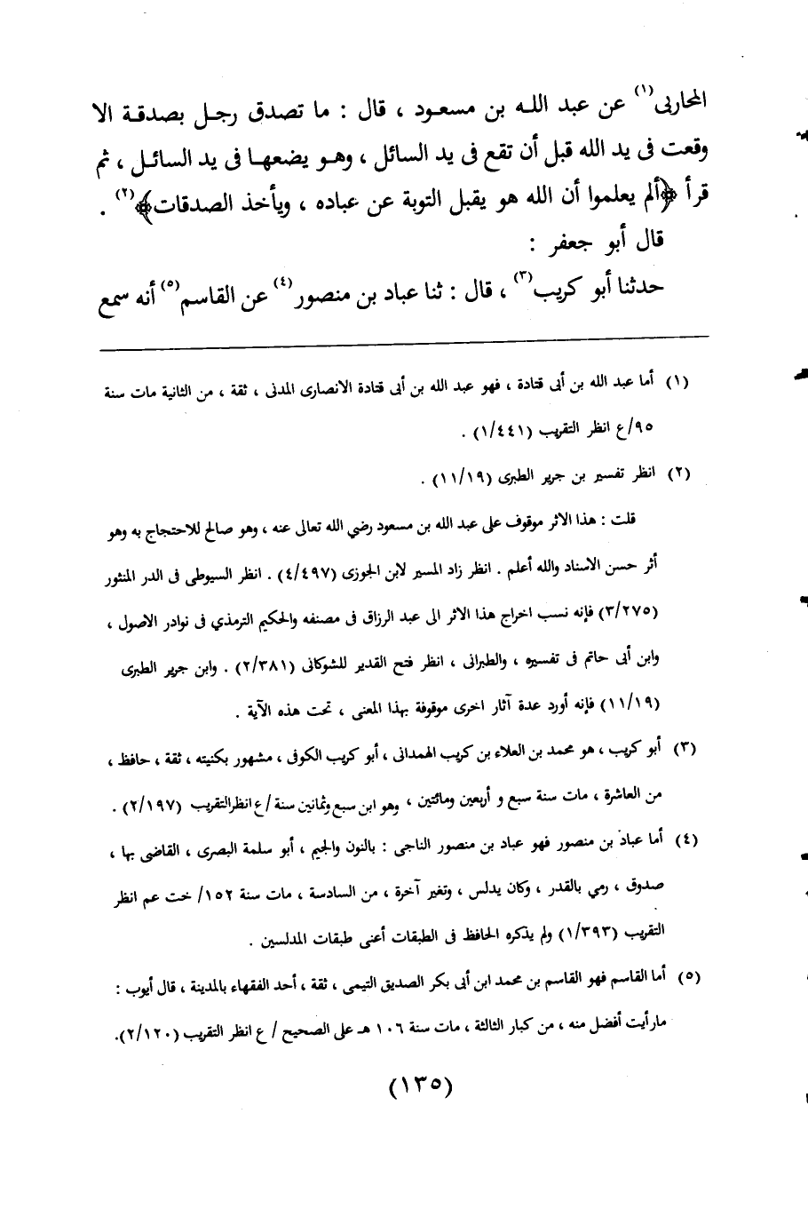 المحاربى (¬1) عن عبد اللَّه بن مسعود، قال: ما تصدق رجل بصدقة الا وقعت فى يد اللَّه قبل أن تقع فى يد السائل، وهو يضعها فى يد السائل، ثم قرأ {أَلَمْ يَعْلَمُوا أَنَّ اللَّهَ هُوَ يَقْبَلُ التَّوْبَةَ عَنْ عِبَادِهِ وَيَأْخُذُ الصَّدَقَاتِ} (¬2).