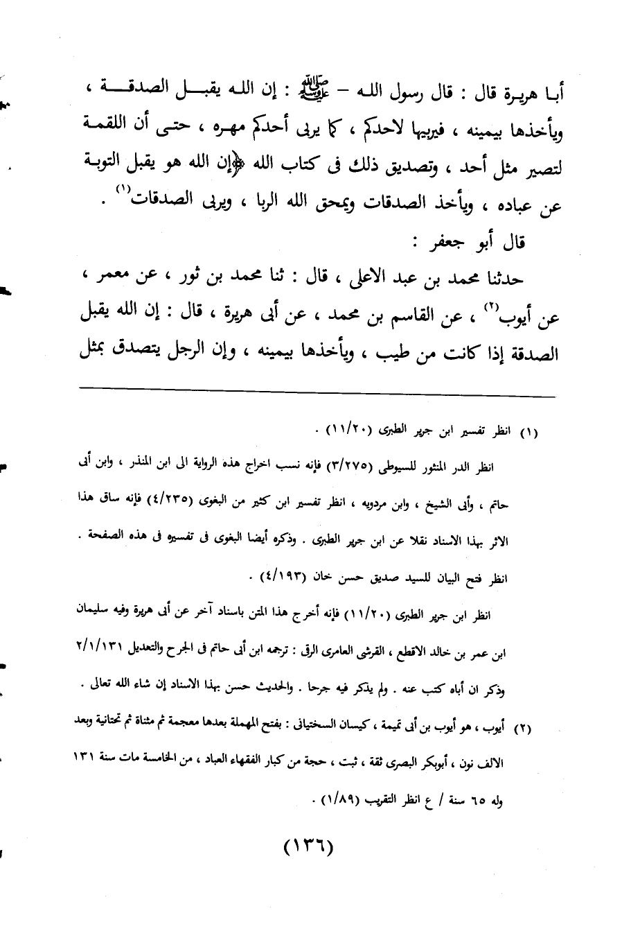 حدثنا محمد بن عبد الاعلى، قال: ثنا محمد بن ثور، عن معمر، عن أيوب (¬2)، عن القاسم بن محمد، عن أبى هريرة، قال: إن اللَّه يقبل الصدقة إذا كانت من طيب، ويأخذها بيمينه، وإن الرجل يتصدق بمثل