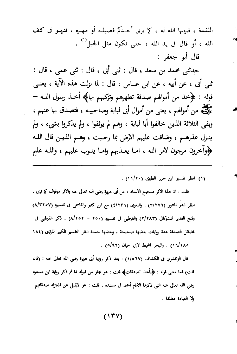 قلت: ان هذا الاثر صحيح الاسناد، عن أبى هريره رضي اللَّه تعالى عنه والاثر موقوف كما ترى. انظر الدر المنثور (276/ 3). والبغوى (236/ 4) مع ابن كثير والقاسمى فى تفسيره (3257/ 8) وفتح القدير للشوكانى (283/ 2) والقرطبى فى تفسيره (250 - 252/ 8). ذكر القرطبى فى فضائل الصدقة عدة روايات بعضها صحيحة، وبعضها حسنة انظر التفسير الكبير للرازى (184 - 185/ 16). والبحر المحيط لابى حيان (96/ 5).