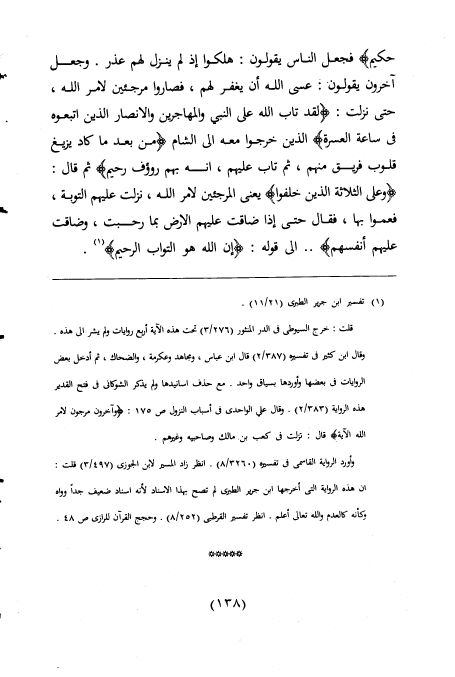 حَكِيمٌ} فجعل الناس يقولون: هلكوا إذ لم ينزل لهم عذر. وجعل آخرون يقولون: عسى اللَّه أن يغفر لهم، فصاروا مرجئين لامر اللَّه، حتى نزلت: {لَقَدْ تَابَ اللَّهُ عَلَى النَّبِيِّ وَالْمُهَاجِرِينَ وَالْأَنْصَارِ الَّذِينَ اتَّبَعُوهُ فِي سَاعَةِ الْعُسْرَةِ} الذين خرجوا معه الى الشام {مِنْ بَعْدِ مَا كَادَ يَزِيغُ قُلُوبُ فَرِيقٍ مِنْهُمْ ثُمَّ تَابَ عَلَيْهِمْ إِنَّهُ بِهِمْ رَءُوفٌ رَحِيمٌ} ثم قال: {وَعَلَى الثَّلَاثَةِ الَّذِينَ خُلِّفُوا} يعنى المرجئين لامر اللَّه، نزلت عليهم التوبة، فعموا بها، فقال {حَتَّى إِذَا ضَاقَتْ عَلَيْهِمُ الْأَرْضُ بِمَا رَحُبَتْ وَضَاقَتْ عَلَيْهِمْ أَنْفُسُهُمْ}. . الى قوله {إِنَّ اللَّهَ هُوَ التَّوَّابُ الرَّحِيمُ} (¬1).