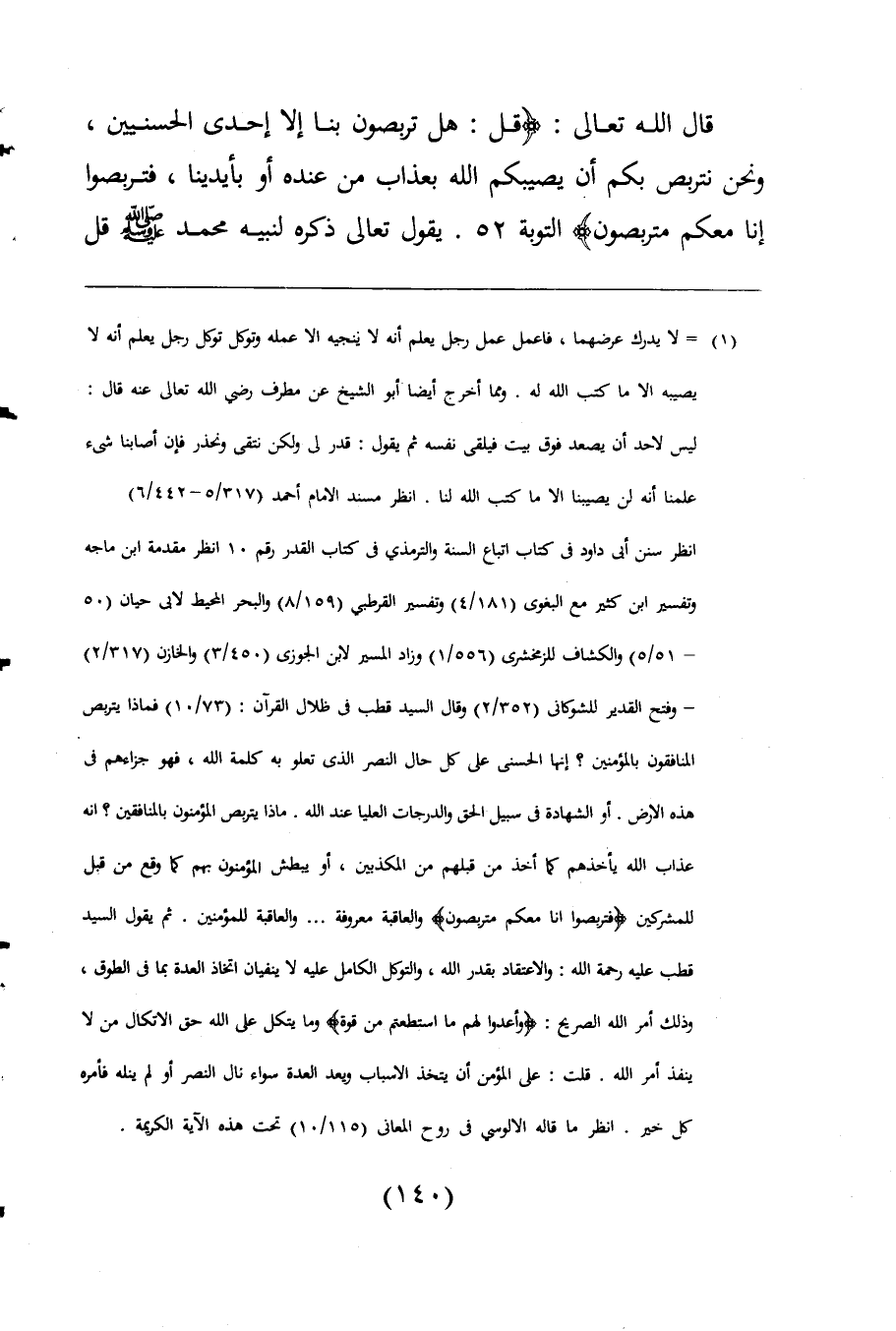 = لا يدرك عرضهما، فاعمل عمل رجل يعلم أنه لا ينجيه الا عمله وتوكل توكل رجل يعلم أنه لا يصيبه الا ما كتب اللَّه له. ومما أخرج أيضا أبو الشيخ عن مطرف رضي اللَّه تعالى عنه قال: ليس لاحد أن يصعد فوق بيت فيلقى نفسه ثم يقول: قدر لى ولكن نتقى ونحذر فإن أصابنا شئ علمنا أنه لن يصيبنا الا ما كتب اللَّه لنا. انظر مسند الإمام أحمد (317/ 5 - 442/ 6) انظر سنن أبى داود فى كتاب اتباع السنة والترمذى فى كتاب القدر رقم 10 انظر مقدمة ابن ماجه وتفسير ابن كثير مع البغوى (181/ 4) وتفسير القرطبى (159/ 8) والبحر المحيط لابى حيان (50 - 51/ 5) والكشاف للزمخشرى (556/ 1) وزاد المسير لابن الجوزى (450/ 3) والخازن (317/ 2) - وفتح القدير للشوكانى (352/ 2) وقال السيد قطب فى ظلال القرآن: (73/ 10) فماذا يتربص المنافقون بالمؤمنين؟ إنها الحسنى على كل حال النصر الذى تعلو به كلمة اللَّه، فهو جزاءهم فى هذه الارض. أو الشهادة فى سبيل الحق والدرجات العليا عند اللَّه. ماذا يتربص المؤمنون بالمنافقين؟ انه عذاب اللَّه يأخذهم كما أخذ من قبلهم من المكذبين، أو يبطش المؤمنين بهم كما وقع من قبل للمشركين {فَتَرَبَّصُوا إِنَّا مَعَكُمْ مُتَرَبِّصُونَ} والعاقبة معروفة. . . والعاقبة للمؤمنين. ثم يقول السيد قطب عليه رحمة اللَّه: والاعتقاد بقدر اللَّه، والتوكل الكامل عليه لا ينفيان اتخاذ العدة بما فى الطوق، وذلك أمر اللَّه الصريح: {وَأَعِدُّوا لَهُمْ مَا اسْتَطَعْتُمْ مِنْ قُوَّةٍ} وما يتكل على اللَّه حق الاتكال من لا ينفذ أمر اللَّه. قلت: على المؤمن أن يتخذ الاسباب ويعد العدة سواء نال النصر أو لم ينله فأمره كل خير. انظر ما قاله الالوسي فى روح المعانى (115/ 10) تحت هذه الآية الكريمة.
