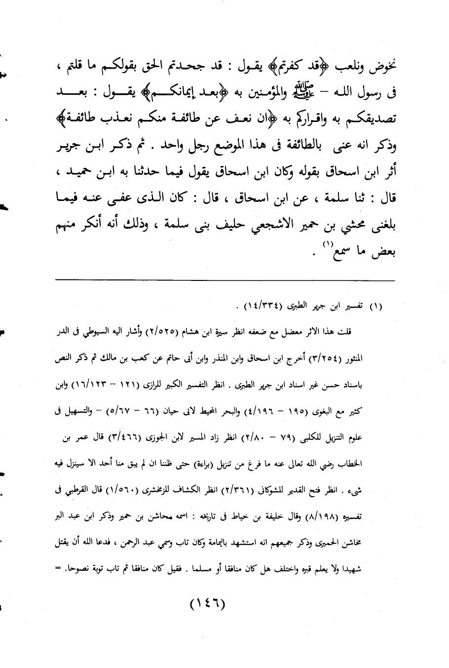 نخوض ونلعب {قَدْ كَفَرْتُمْ} يقول: قد جحدتم الحق بقولكم ما قلتم، فى رسول اللَّه -صلى اللَّه عليه وسلم- والمؤمنين به {بَعْدَ إِيمَانِكُمْ} يقول: بعد تصديقكم به واقراركم به {إِنْ نَعْفُ عَنْ طَائِفَةٍ مِنْكُمْ نُعَذِّبْ طَائِفَةً} وذكر انه عنى بالطائفة فى هذا الموضع رجل واحد. ثم ذكر ابن جرير أثر ابن اسحاق بقوله وكان ابن اسحاق يقول فيما حدثنا به ابن حميد، قال: ثنا سلمة، عن ابن اسحاق، قال: كان الذى عفى عنه فيما بلغنى محشى بن حمير الاشجعى حليف بنى سلمة، وذلك أنه أنكر منهم بعض ما سمع (¬1).