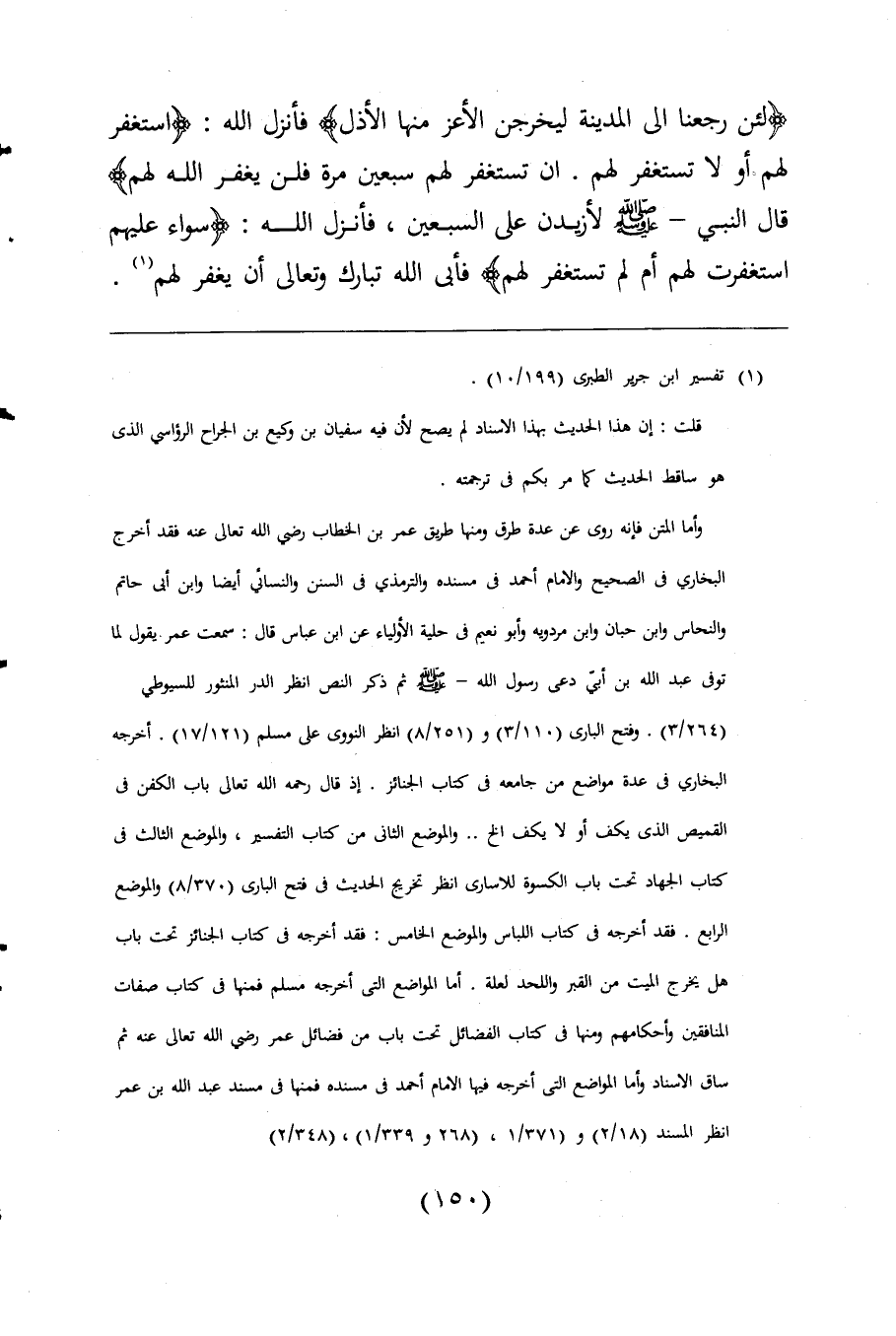 وأما المتن فإنه روى عن عدة طرق ومنها طريق عمر بن الخطاب رضي اللَّه تعالى عنه فقد أخرج البخارى فى الصحيح والإمام أحمد فى مسنده والترمذى فى السنن والنسائى أيضا وابن أبى حاتم والنحاس وابن حبان وابن مردويه وأبو نعيم فى حلية الأولياء عن ابن عباس قال: سمعت عمر يقول لما توفى عبد اللَّه بن أبيّ دعى رسول اللَّه -صلى اللَّه عليه وسلم- ثم ذكر النص انظر الدر المنثور للسيوطى (264/ 3). وفتح البارى (110/ 3) و (251/ 8) انظر النووى على مسلم (121/ 17). أخرجه البخارى فى عدة مواضع من جامعه فى كتاب الجنائز. إذ قال رحمه اللَّه تعالى باب الكفن فى القميص الذى يكف أو لا يكف الخ. . والموضع الثاني من كتاب التفسير، والموضع الثالث فى كتاب الجهاد تحت باب الكسوة للاسارى انظر تخريج الحديث فى فتح البارى (370/ 8) والموضع الرابع. فقد أخرجه فى كتاب اللباس والموضع الخامس: فقد أخرجه فى كتاب الجنائز تحت باب هل يخرج الميت من القبر واللحد لعلة. أما المواضع التى أخرجه مسلم فمنها فى كتاب صفات المنافقين وأحكامهم ومنها فى كتاب الفضائل تحت باب من فضائل عمر رضي اللَّه تعالى عنه ثم ساق الاسناد وأما المواضع التى أخرجه فيها الإمام أحمد فى مسنده فمنها فى مسند عبد اللَّه بن عمر انظر المسند (18/ 2) و (371/ 1)، (268 و 339/ 1)، (348/ 2)
