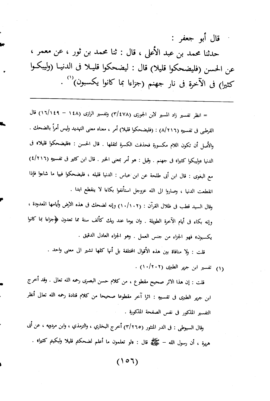 حدثنا محمد بن عبد الأعلى، قال: ثنا محمد بن ثور، عن معمر، عن الحسن (فليضحكوا قليلا) قال: ليضحكوا قليلا فى الدنيا (وليبكوا كثيرا) فى الآخرة فى نار جهنم (جزاءا بما كانوا يكسبون) (¬1).