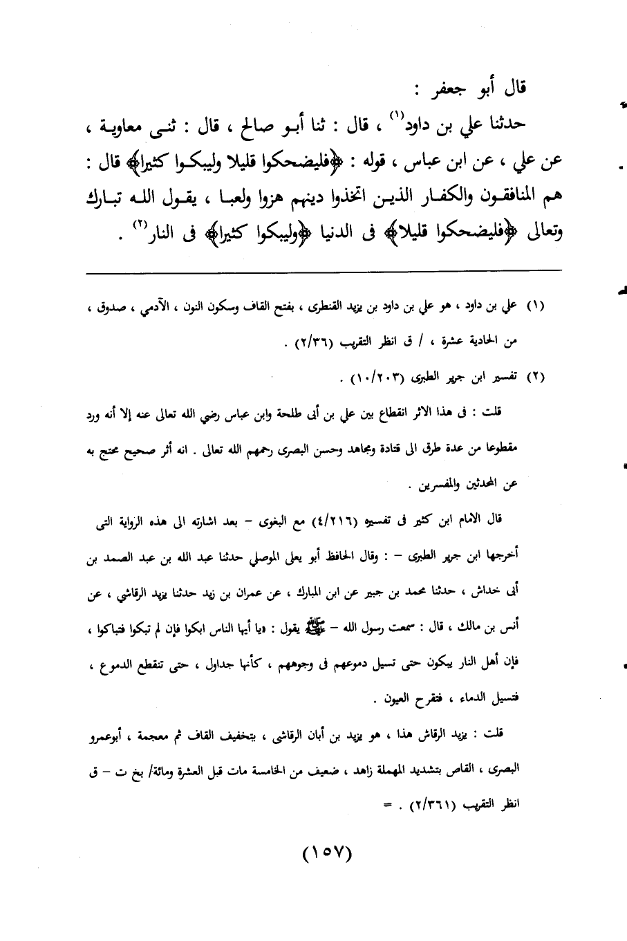 حدثنا علي بن داود (¬1)، قال: ثنا أبو صالح، قال: ثنى معاوية، عن علي، عن ابن عباس، قوله: {فَلْيَضْحَكُوا قَلِيلًا وَلْيَبْكُوا كَثِيرًا} قال: هم المنافقون والكفار الذين اتخذوا دينهم هزوا ولعبا، يقول اللَّه تبارك وتعالى {فَلْيَضْحَكُوا قَلِيلًا} فى الدنيا {وَلْيَبْكُوا كَثِيرًا} فى النار (¬2).