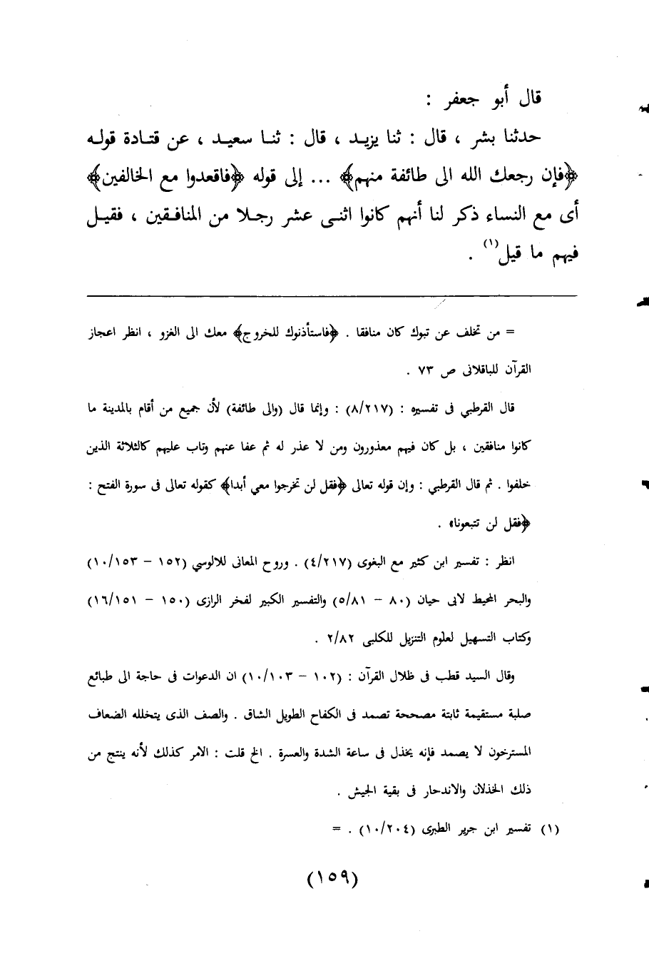 حدثنا بشر، قال: ثنا يزيد، قال: ثنا سعيد، عن قتادة قوله {فَإِنْ رَجَعَكَ اللَّهُ إِلَى طَائِفَةٍ مِنْهُمْ}. . . الى قوله {فَاقْعُدُوا مَعَ الْخَالِفِينَ} أى مع النساء ذكر لنا أنهم كانوا اثنى عشر رجلا من المنافقين، فقيل فيهم ما قيل (¬1).