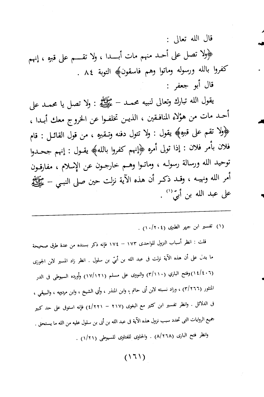 قال اللَّه تعالى: {وَلَا تُصَلِّ عَلَى أَحَدٍ مِنْهُمْ مَاتَ أَبَدًا وَلَا تَقُمْ عَلَى قَبْرِهِ إِنَّهُمْ كَفَرُوا بِاللَّهِ وَرَسُولِهِ وَمَاتُوا وَهُمْ فَاسِقُونَ} التوبة: 84.