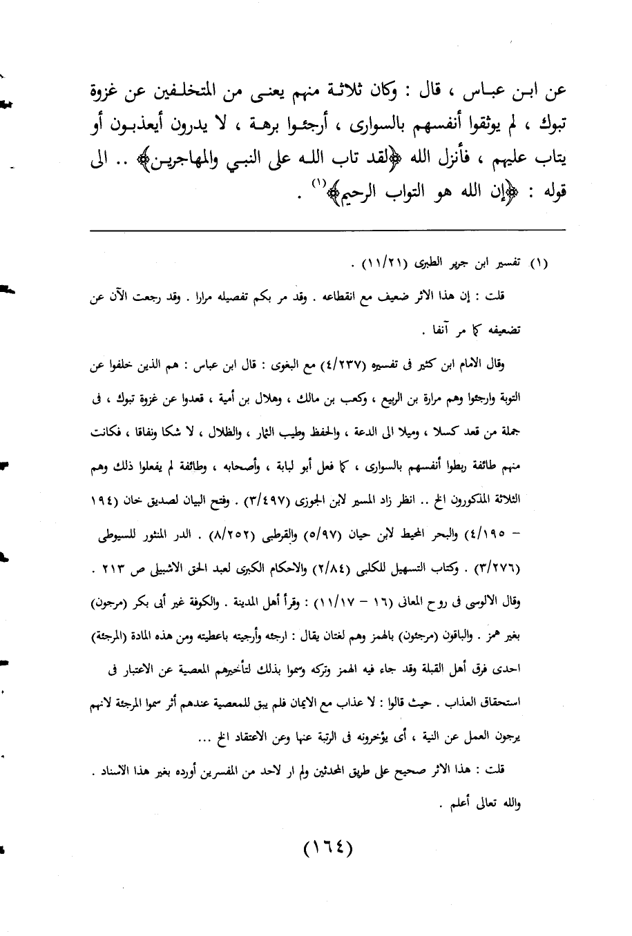عن ابن عباس، قال: وكان ثلاثة منهم يعنى من المتخلفين عن غزوة تبوك، لم يوثقوا أنفسهم بالسوارى، أرجئوا برهة، لا يدرون أيعذبون أو يتاب عليهم، فأنزل اللَّه {لَقَدْ تَابَ اللَّهُ عَلَى النَّبِيِّ وَالْمُهَاجِرِينَ}. . الى قوله: {إِنَّ اللَّهَ هُوَ التَّوَّابُ الرَّحِيمُ} (¬1).