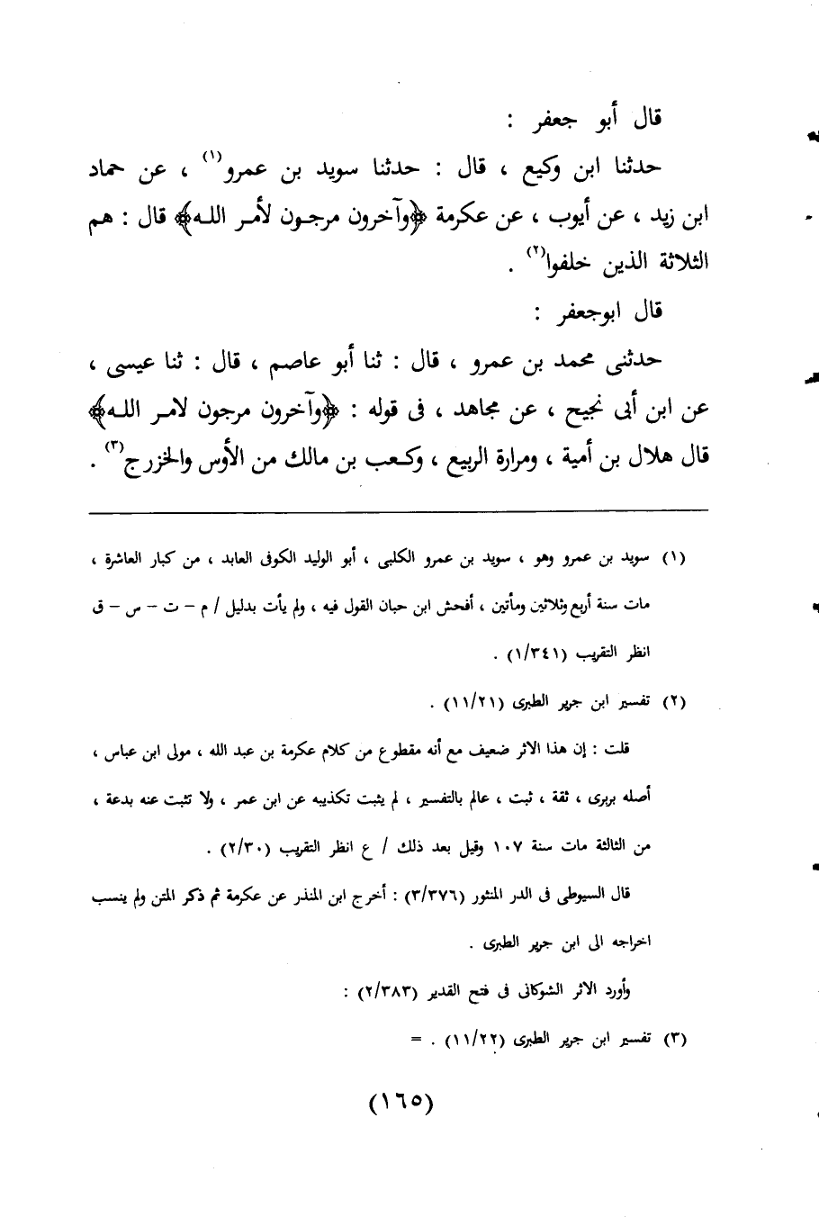 حدثنا ابن وكيع، قال: حدثنا سويد بن عمرو (¬1)، عن حماد ابن زيد، عن أيوب، عن عكرمة {وَآخَرُونَ مُرْجَوْنَ لِأَمْرِ اللَّهِ} قال: هم الثلاثة الذين خلفوا (¬2).