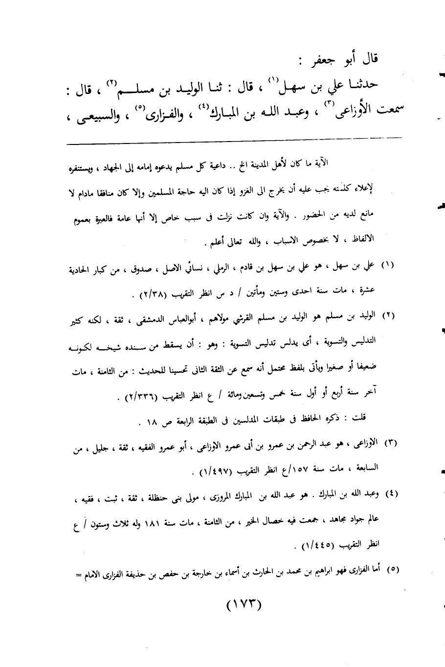 حدثنا علي بن سهل (¬1)، قال: ثنا الوليد بن مسلم (¬2)، قال: سمعت الأوزاعى (¬3)، وعبد اللَّه بن المبارك (¬4)، والفزارى (¬5)، والسبيعى،