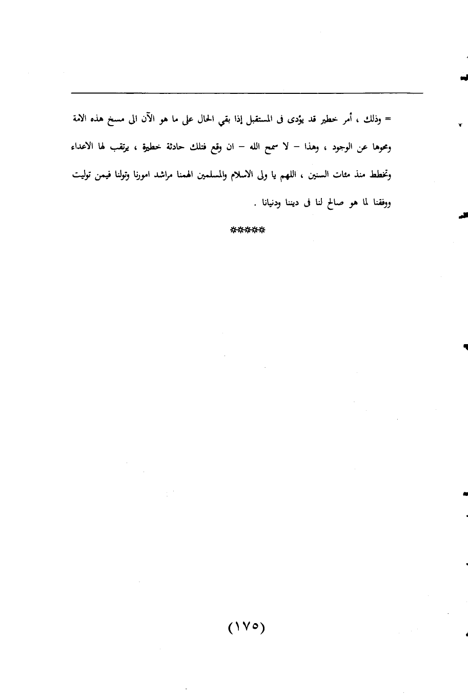 = وذلك، أمر خطير قد يؤدى فى المستقبل إذا بقى الحال على ما هر الآن الى مسخ هذه الامة ومحوها عن الوجود، وهذا -لا سمح اللَّه- ان وقع فتلك حادثة خطرة، يرتقب لها الاعداء وتخطط منذ مئات السنين، اللهم يا ولى الاسلام والمسلمين الهمنا مراشد امورنا وتولنا فيمن توليت ووفقنا لما هو صالح لنا فى ديننا ودنيانا.