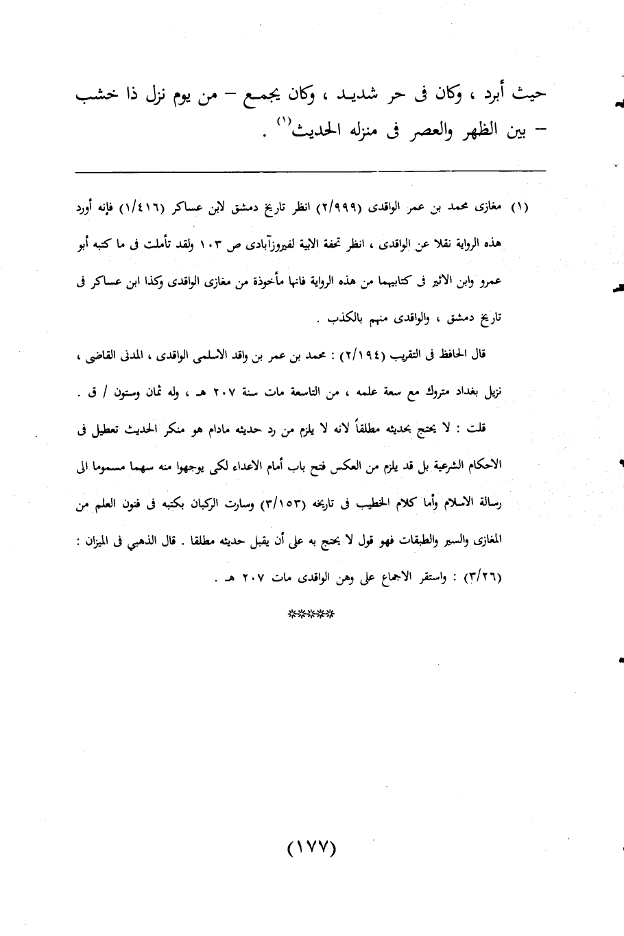 قلت: لا يحتج بحديثه مطلقًا لأنه لا يلزم من رد حديثه ما دام هو منكر الحديث تعطيل فى الاحكام الشرعية بل قد يلزم من العكس فتح باب أمام الاعداء لكى يوجهوا من سهما مسموما الى رسالة الاسلام وأما كلام الخطيب فى تاريخه (153/ 3) وسارت الركبان بكتبه فى فنون العلم من المغازى والسر والطبقات فهو قول لا يحتج به على أن يقبل حديثه مطلقا. قال الذهبى فى الميزان: (26/ 3): واستقر الاجماع على وهن الواقدى مات 207 هـ.