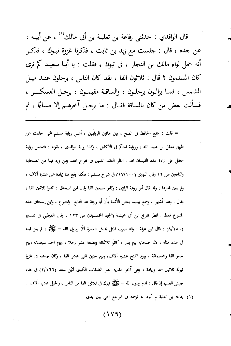= قلت: جمع الحافظ فى الفتح، بين هاتين الروايتين، أعنى رواية مسلم التى جاءت عن طريق معقل بن عبيد اللَّه، ورواية الحاكم فى الاكليل، وكذا رواية الواقدى، بقوله: فتحمل رواية معقل على ارادة عدد الفرسان اهـ. انظر العقد الثمين فى فتوح الهند ومن ورد فيها من الصحابة والتابعين ص 12 وقال النووي (100/ 17) فى شرح مسلم: هكذا وقع هنا زيادة على عشرة آلاف، ولم يبين قدرها، وقد قال أبو زرعة الرازى: وكانوا سبعين الفا وقال ابن اسحاق: كانوا ثلاثين الفا، وقال: وهذا أشهر، وجمع بينهما بعض الأئمة بأن أبا زرعة عد التابع والمتبوع، وابن إسحاق عدد المتبوع فقط. انظر تاريخ ابن أبى خيثمة (الجزء الخمسون) ص 123. وقال القرطبى فى تفسيره (280/ 8): قال ابن عرفة: وانما ضرب المثل بجيش العسرة لأن رسول اللَّه -صلى اللَّه عليه وسلم-، لم يغز قبله فى عدد مثله، لأن اصحابه يوم بدر، كانوا ثلاثمائة وبضعة عشر رجلا، ويوم احد سبعمائة ويوم خيبر الفا وخمسمائة، ويوم الفتح عشرة آلاف، ويوم حنين اثنى عشر الفا، وكان جيشه فى غزوة تبوك ثلاثين الفا وزيادة، وهي آخر مغازيه انظر الطبقات الكبرى لابن سعد (166/ 2) فى عدد جيش العسرة إذ قال: قدم رسول اللَّه -صلى اللَّه عليه وسلم- تبوك فى ثلاثين الفا من الناس، والخيل عشرة آلاف.