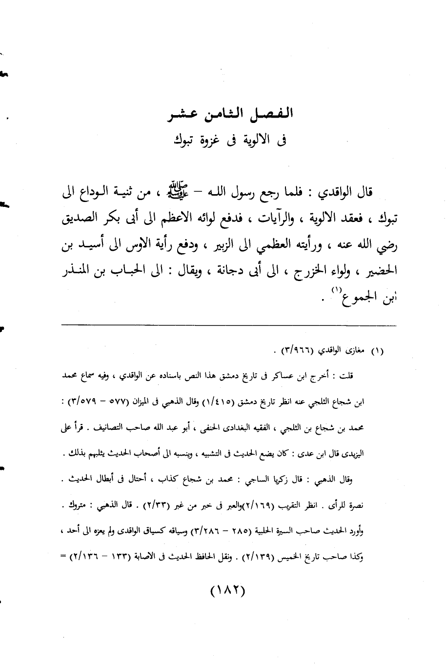 وقال الذهبي: قال زكريا الساجي: محمد بن شجاع كذاب، أحتال فى أبطال الحديث. نصرة للرأى. انظر التقريب (169/ 2) والحبر فى خبر من غير (33/ 2). قال الذهبى: متروك. وأورد الحديث صاحب السير الحلبية (285 - 286/ 3) وسياقه كسياق الواقدى ولم يعزه الى أحد، وكذا صاحب تاريخ الخميس (239/ 2). ونقل الحافظ الحديث فى الاصابة (133 - 236/ 1) =