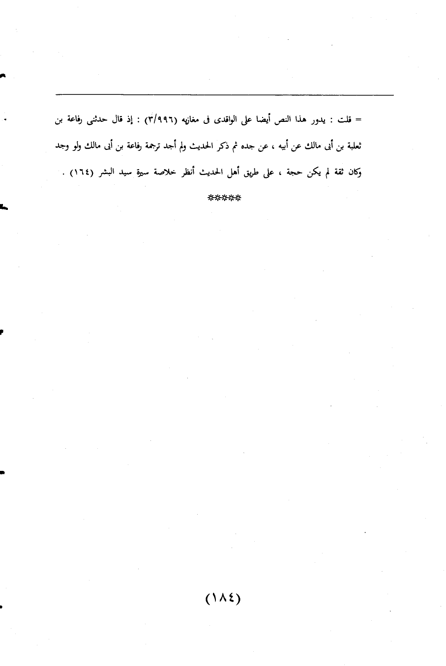 = قلت: يدور هذا النص أيضا على الواقدى فى مغازيه (996/ 3): إذ قال حدثنى رفاعة بن ثعلبة بن أبى مالك عن أبيه، عن جده ثم ذكر الحديث ولم أجد ترجمة رفاعة بن أبى مالك ولو وجد وكان ثقة لم يكن حجة، على طريق أهل الحديث انظر خلاصة سيرة سيد البشر (164).