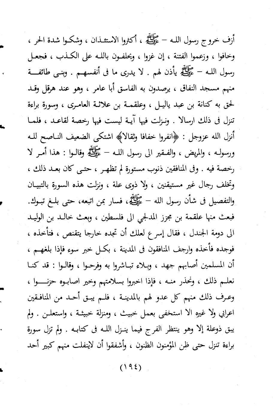 أزف خروج رسول اللَّه -صلى اللَّه عليه وسلم-، أكثروا الاستئذان، وشكوا شدة الحر، وخافوا، وزعموا الفتنة، إن غزوا، ويحلفون باللَّه على الكذب، فجعل رسول اللَّه -صلى اللَّه عليه وسلم- يأذن لهم. لا يدرى ما فى أنفسهم. وبنى طائفة منهم مسجد النفاق، يرصدون به الفاسق أبا عامر، وهو عند هرقل وقد لحق به كنانة بن عبد ياليل، وعلقمة بن علاثة العامرى، وسورة براءة تنزل فى ذلك ارسالا. ونزلت فيها آية ليست فيها رخصة لقاعد، فلما أنزل اللَّه عز وجل: {انْفِرُوا خِفَافًا وَثِقَالًا} اشتكى الضعيف الناصح للَّه ورسوله، والمريض، والفقير الى رسول اللَّه -صلى اللَّه عليه وسلم- وقالوا: هذا أمر لا رخصة فيه. وفى المنافقين ذنوب مستورة لم تظهر، حتى كان بعد ذلك، وتخلف رجال غير مستيقنين، ولا ذوى علة، ونزلت هذه السورة بالتبيان والتفصيل فى شأن رسول اللَّه -صلى اللَّه عليه وسلم-، فسار بمن اتبعه، حتى بلغ تبوك. فبعث منها علقمة بن مجزز المدلجي الى فلسطين، وبعث خالد بن الوليد الى دومة الجندل، فقال إسرع لعلك أن تجده خارجا يتقنص، فتأخذه، فوجده فأخذه وارجف المنافقون فى المدينة، بكل خبر سوء فإذا بلغهم، أن المسلمين أصابهم جهد، وبلاء تباشروا به وفرحوا، وقالوا: قد كنا نعلم ذلك، ونحذر منه، فإذا اخبروا بسلامتهم وخير اصابوه حزنوا، وعرف ذلك منهم كل عدو لهم بالمدينة، فلم يبق أحد من المنافقين اعرابي ولا غيره الا استخفى بعمل خبيث، ومنزلة خبيثة، واستعلن. ولم يبق ذوعلة إلا وهو ينتظر الفرج فيما ينزل اللَّه فى كتابه. ولم تزل سورة براءة تنزل حتى ظن المؤمنون الظنون، وأشفقوا أن لا ينفلت منهم كبير أحد