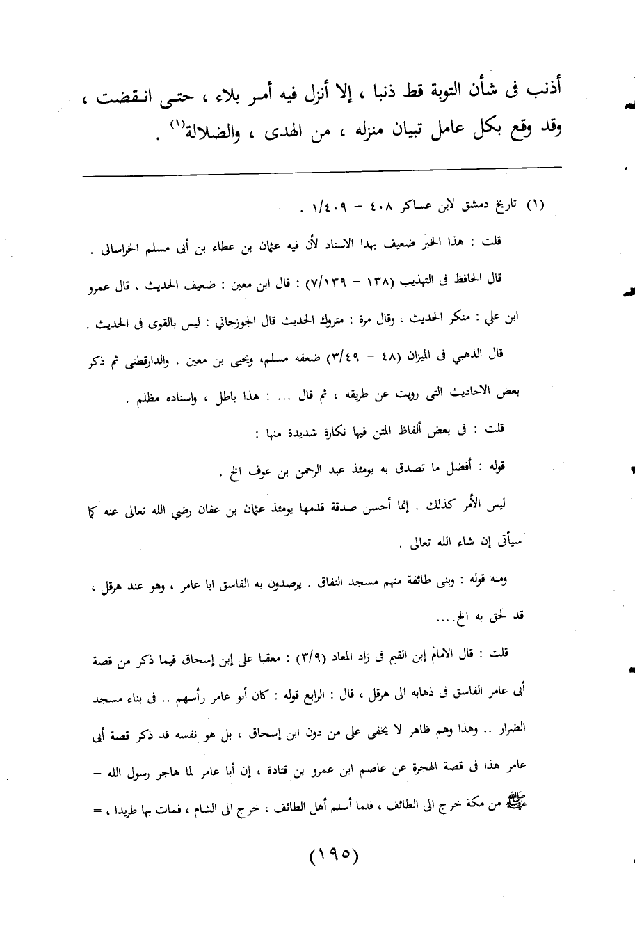 قلت: قال الامام ابن القيم فى زاد المعاد (3/ 9): معقبا على ابن إسحاق فيما ذكر من قصة أبى عامر الفاسق فى ذهابه الى هرقل، قال: الرابع قوله: كان أبو عامر رأسهم. . فى بناء مسجد الضرار. . وهذا وهم ظاهر لا يخفى على من دون ابن إسحاق، بل هو نفسه قد ذكر قصة أبى عامر هذا فى قصة الهجرة عن عاصم ابن عمرو بن قتادة، إن أبا عامر لما هاجر رسول اللَّه -صلى اللَّه عليه وسلم- من مكة خرج الى الطائف، فلما أسلم أهل الطائف، خرج الى الشام، فمات بها طريدا،=