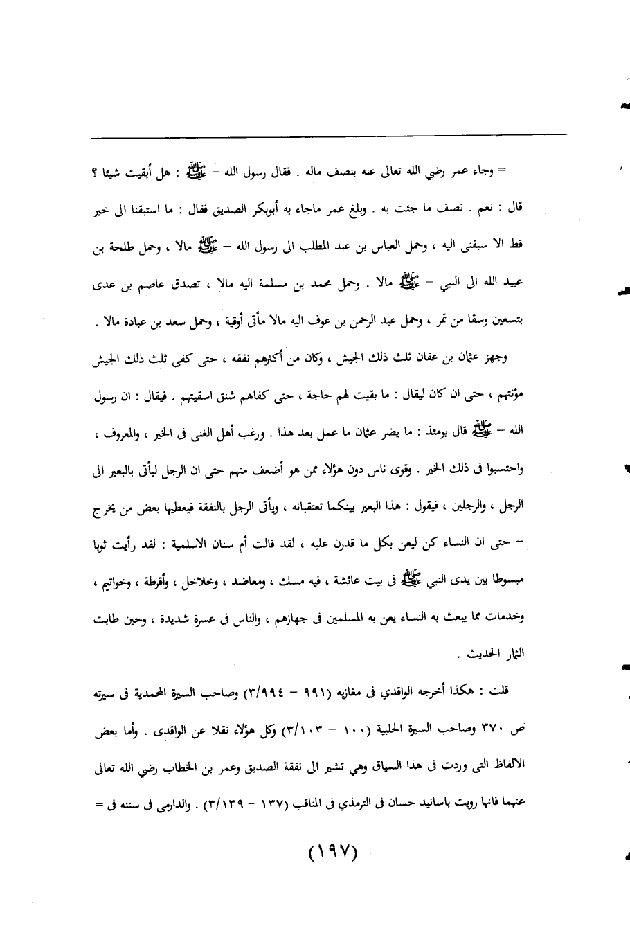قلت: هكذا أخرجه الواقدي فى مغازيه (991 - 994/ 3) وصاحب السيرة المحمدية فى سيرته ص 370 وصاحب السيرة الحلبية (100 - 103/ 3) وكل هؤلاء نقلا عن الواقدى. وأما بعض الالفاظ التى ورت فى هذا السياق وهي تشير الى نفقة الصديق وعمر بن الخطاب رضي اللَّه تعالى عنهما فإنها رويت باسانيد حسان فى الترمذي فى المناقب (137 - 139/ 3). والدارمى فى سننه فى =
