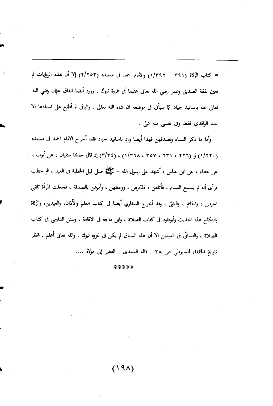وأما ما ذكر النساء وتصدقهن بهذا أيضا ورد باسانيد جياد فقد أخرج الامام احمد فى مسنده (220/ 1) و (226، 231، 357، 368/ 1)، (34/ 3) إذ قال حدثنا سفيان، عن أيوب، عن عطاء، عن ابن عباس، أشهد على رسول اللَّه -صلى اللَّه عليه وسلم- صلى قبل الخطبة فى العيد، ثم خطب فرأى أنه لم يسمع النساء، فأتاهن، فذكرهن، ووعظهن، وأمرهن بالصدقة، فجعلت المرأة تلقى الخرص، والخاتم، والشيء، وقد أخرج البخارى أيضا فى كتاب العلم والآذان، والعيدين، والزكاة والنكاح هذا الحديث وأبو داود فى كتاب الصلاة، وابن ماجه فى الاقامة، وسنن الدارمى فى كتاب الصلاة، والنسائي فى العيدين الا أن هذا السياق لم يكن فى غزوة تبوك. واللَّه تعالى أعلم انظر تاريخ الخلفاء للسيوطى ص 38. قاله السندى. الفقير الى مولاه. . .