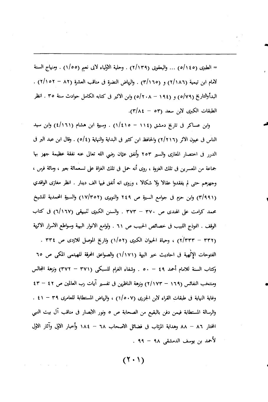 وابن عساكر فى تاريخ دمشق (114 - 415/ 1). وسيرة ابن هشام (161/ 4) وابن سيد الناس فى عيون الاثر (216/ 2) والحافظ ابن كثير فى البداية والنهاية (4/ 5). وقال ابن عبد البر فى الدرر فى اختصار المغازى والسير 253 وأنفق عثمان رضي اللَّه تعالى عنه نفقة عظيمة جهز بها جماعة من المعسرين فى تلك الغزوة، روى أنه حمل فى تلك الغزاة على تسعمائة بعير، ومائة فرس، وجهزهم حتى لم يفقدوا عقالا ولا شكالا، وروى انه أنفق فيها الف دينار. انظر مغازى الواقدى (991/ 3) وابن حزم فى جوامع السيرة ص 249 والنويرى (352/ 17) والسيرة المحمدية للشيخ محمد كرامت على الهدى ص 370 - 373. والسنن الكبرى للبيهقى (167/ 6) فى كتاب الوقف. النموذج اللبيب فى خصائص الحبيب ص 61. ولوامع الانوار البهية وسواطع الاسرار الاثرية (332 - 333/ 2)، وحياة الحيوان الكبرى (52/ 1) وتاريخ الموصل للازدى ص 334. الفتوحات الإلهية فى احاديث خير البرية (171/ 1) والصواعق المحرقة للهيتمى المكى ص 65 وكتاب السنة للامام أحمد 49 - 50. وشفاء الغرام للسبكى (371 - 372) ونزهة المجالس ومنتخب النفائس (169 - 73/ 2) ونزهة الناظرين فى تفسر آيات رب العالمين ص 42 - 43 وغاية النهاية فى طبقات القراء لابن الجزرى (507/ 1)، والرياض المستطابة للعامرى 39 - 41. والرسالة المستطابة فيمن دفن بالبقيع من الصحابة ص 5 ونور الابصار فى مناقب آل بيت النبي المختار 86 - 88 وهداية المرتاب فى فضائل الاصحاب 68 - 184 وأخبار الاول وآثار الاول لأحمد بن يوسف الدمشقى 98 - 99.