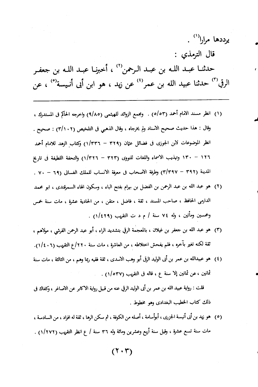 (¬5) هو زيد بن أبى أنيسة الجزرى، أبو أسامة، أصله من الكوفة، ثم سكن الرها، ثقة له افراد، من السادسة، مات سنة تسع عشرة، وقيل سنة أربع وعشرين ومائة وله 36 سنة / ع انظر التقريب (272/ 1).