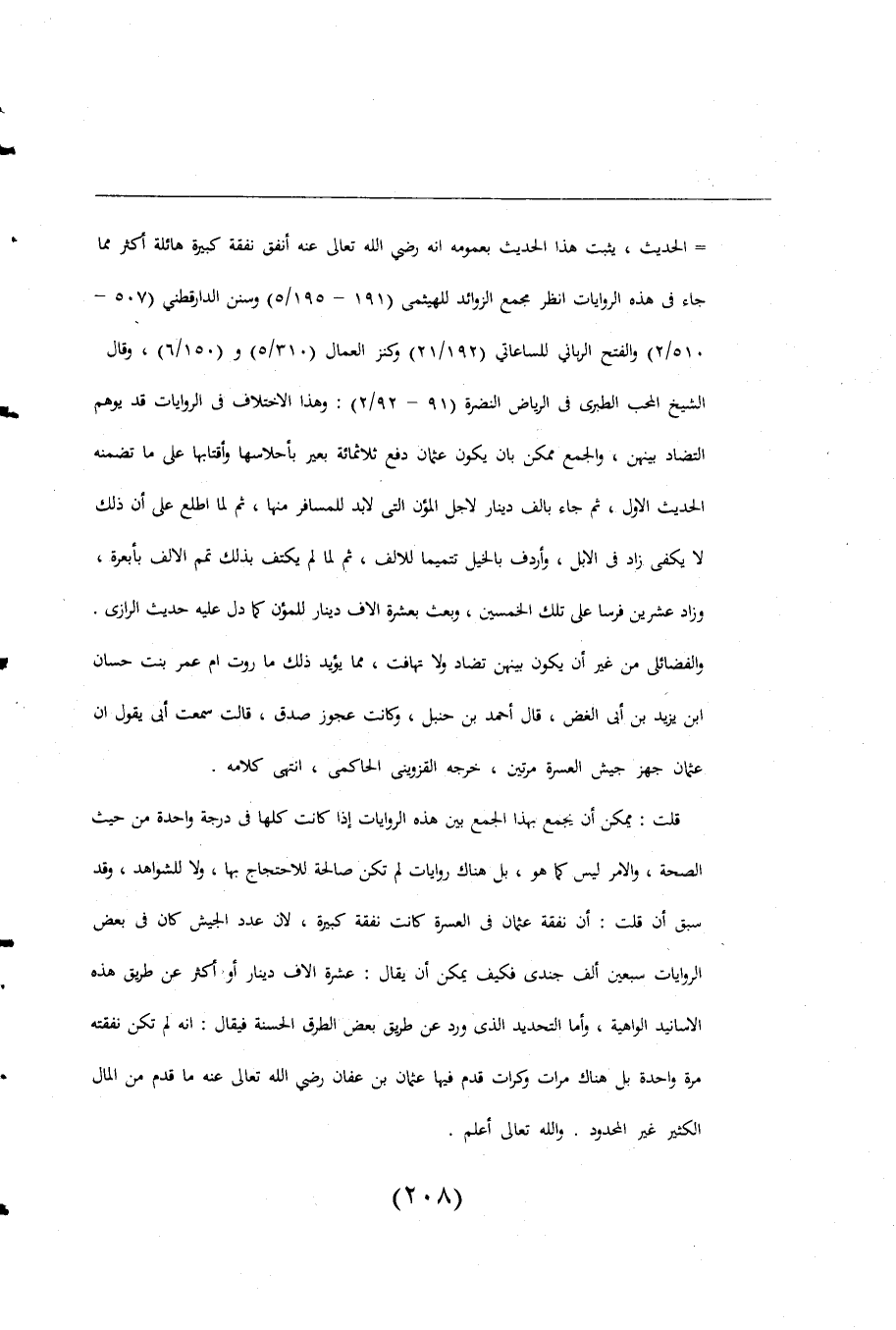 = الحديث، يثبت هذا الحديث بعمومه انه رضي اللَّه تعالى عنه أنفق نفقة كبيرة هائلة أكثر مما جاء فى هذه الروايات انظر مجمع الزوائد للهيثمى (191 - 195/ 5) وسنن الدارقطني (507 - 510/ 2) الفتح الرباني للساعاتي (192/ 21) وكنز العمال (310/ 5) و (150/ 6)، وقال الشيخ المحب الطبرى فى الرياض النضرة (91 - 92/ 2): وهذا الاختلاف فى الروايات قد يوهم التضاد بينهن، والجمع ممكن بان يكون عثمان دفع ثلاثمائة بعير بأحلاسها وأقتابها على ما تضمنه الحديث الاول، ثم جاء بالف دينار لاجل المؤن التى لابد للمسافر منها، ثم لما اطلع على أن ذلك لا يكفى زاد فى الابل، وأردف بالخيل تتميما للالف، ثم لما لم يكتف بذلك تمم الالف بأبعرة، وزاد عشرين فرسا على تلك الخمسين، وبعث بعشرة الاف دينار للمؤن كما دل عليه حديث الرازى والفضائلى من غير أن يكون بيهن تضاد لا تهافت، مما يؤيد ذلك ما روت ام عمر بنت حسان ابن يزيد بن أبى الغض، قال أحمد بن حنبل، وكانت عجوز صدق، قالت سمعت أبى يقول ان عثمان جهز جيش العسرة مرتين، خرجه القزوينى الحاكمى، انتهى كلامه.