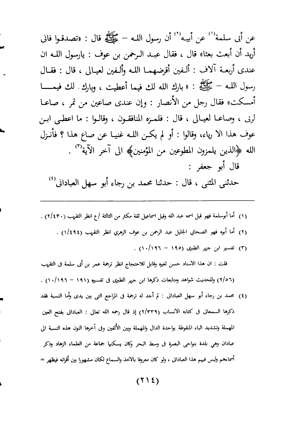 (¬4) محمد بن رجاء أبو سهل العبادانى: لم أجد له ترجمة فى المراجع التى بين يدى وأما النسبة فقد ذكرها السمعانى فى كتابه الانساب (339/ 2) إذ قال رحمه اللَّه تعالى: العبادانى بفتح العين المهملة وتشديد الباء المنقوطة بواحدة الدال والمهملة وبين الألفين وفى آخرها النون هذه النسبة الى عبادان وهي بلدة بنواحى البصرة فى وسط البحر وكان يسكنها جماعة من العلماء الزهاد وذكر أسماءهم وليس فيهم هذا العبادانى، ولو كان معروفا بالاخذ والسماع لكان مشهورا بين أقرانه فيظهر =