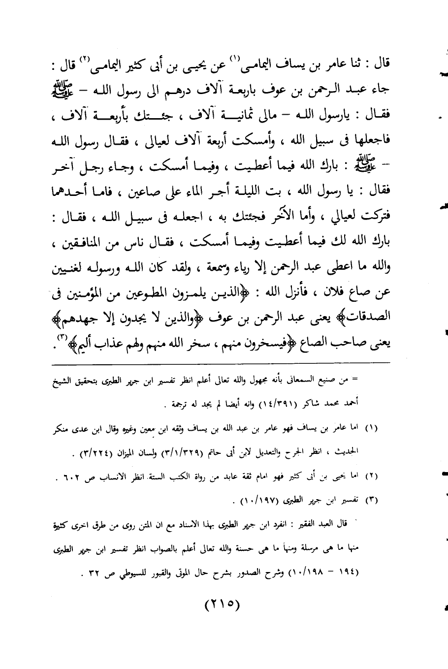 قال: ثنا عامر بن يساف اليمامى (¬1) عن يحيى بن أبى كثير اليمامى (¬2) قال: جاء عبد الرحمن بن عوف باربعة آلاف درهم الى رسول اللَّه -صلى اللَّه عليه وسلم- فقال: يا رسول اللَّه- مالى ثمانية آلاف، جئتك بأربعة آلاف، فاجعلها فى سبيل اللَّه، وأمسكت أربعة آلاف لعيالى، فقال رسول اللَّه -صلى اللَّه عليه وسلم-: بارك اللَّه فيما أعطيت، وفيما أمسكت، وجاء رجل آخر فقال: يا رسول اللَّه، بت الليلة أجر الماء على صاعين، فأما أحدهما فتركت لعيالي، وأما الآخر فجئتك به، اجعله فى سبيل اللَّه، فقال: بارك اللَّه لك فيما أعطيت وفيما أمسكت، فقال ناس من المنافقين، واللَّه ما اعطى عبد الرحمن إلا رياء وسمعة، ولقد كان اللَّه ورسوله لغنيين عن صاع فلان، فأنزل اللَّه: {الَّذِينَ يَلْمِزُونَ الْمُطَّوِّعِينَ مِنَ الْمُؤْمِنِينَ فِي الصَّدَقَاتِ} يعنى عبد الرحمن بن عوف {وَالَّذِينَ لَا يَجِدُونَ إِلَّا جُهْدَهُمْ} يعنى صاحب الصاع {فَيَسْخَرُونَ مِنْهُمْ سَخِرَ اللَّهُ مِنْهُمْ وَلَهُمْ عَذَابٌ أَلِيمٌ} (¬3).