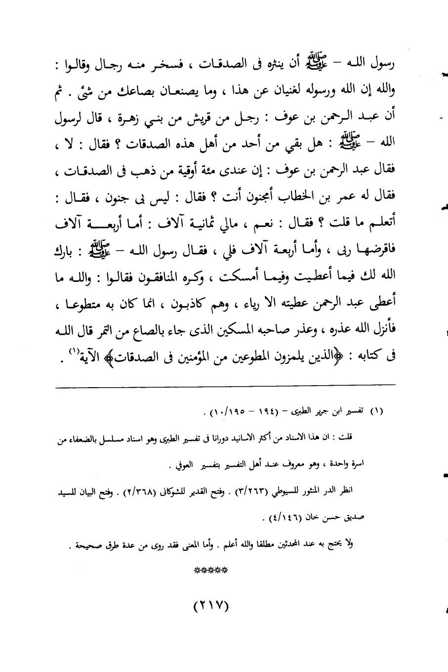 رسول اللَّه -صلى اللَّه عليه وسلم- أن ينثره فى الصدقات، فسخر منه رجال وقالوا: واللَّه إن اللَّه ورسوله لغنيان عن هذا، وما يصنعان بصاعك من شيء. ثم أن عبد الرحمن بن عوف: رجل من قريش من بنى زهرة، قال لرسول اللَّه -صلى اللَّه عليه وسلم-: هل بقى من أحد من أهل هذه الصدقات؟ فقال: لا، فقال عبد الرحمن بن عوف: إن عندى مئة أوقية من ذهب فى الصدقات، فقال له عمر بن الخطاب أمجنون أنت؟ فقال: ليس بى جنون، فقال: أتعلم ما قلت؟ فقال: نعم، مالي ثمانية آلاف: أما أربعة آلاف فاقرضها ربى، وأما أربعة آلاف فلي، فقال رسول اللَّه -صلى اللَّه عليه وسلم-: بارك اللَّه لك فيما أعطيت وفيما أمسكت، وكره المنافقون فقالوا: واللَّه ما أعطى عبد الرحمن عطيته الا رياء، وهم كاذبون، انما كان به متطوعا، فأنزل اللَّه عذره، وعذر صاحبه المسكين الذى جاء بالصاع من التمر قال اللَّه فى كتابه: {الَّذِينَ يَلْمِزُونَ الْمُطَّوِّعِينَ مِنَ الْمُؤْمِنِينَ فِي الصَّدَقَاتِ} الآية (¬1).