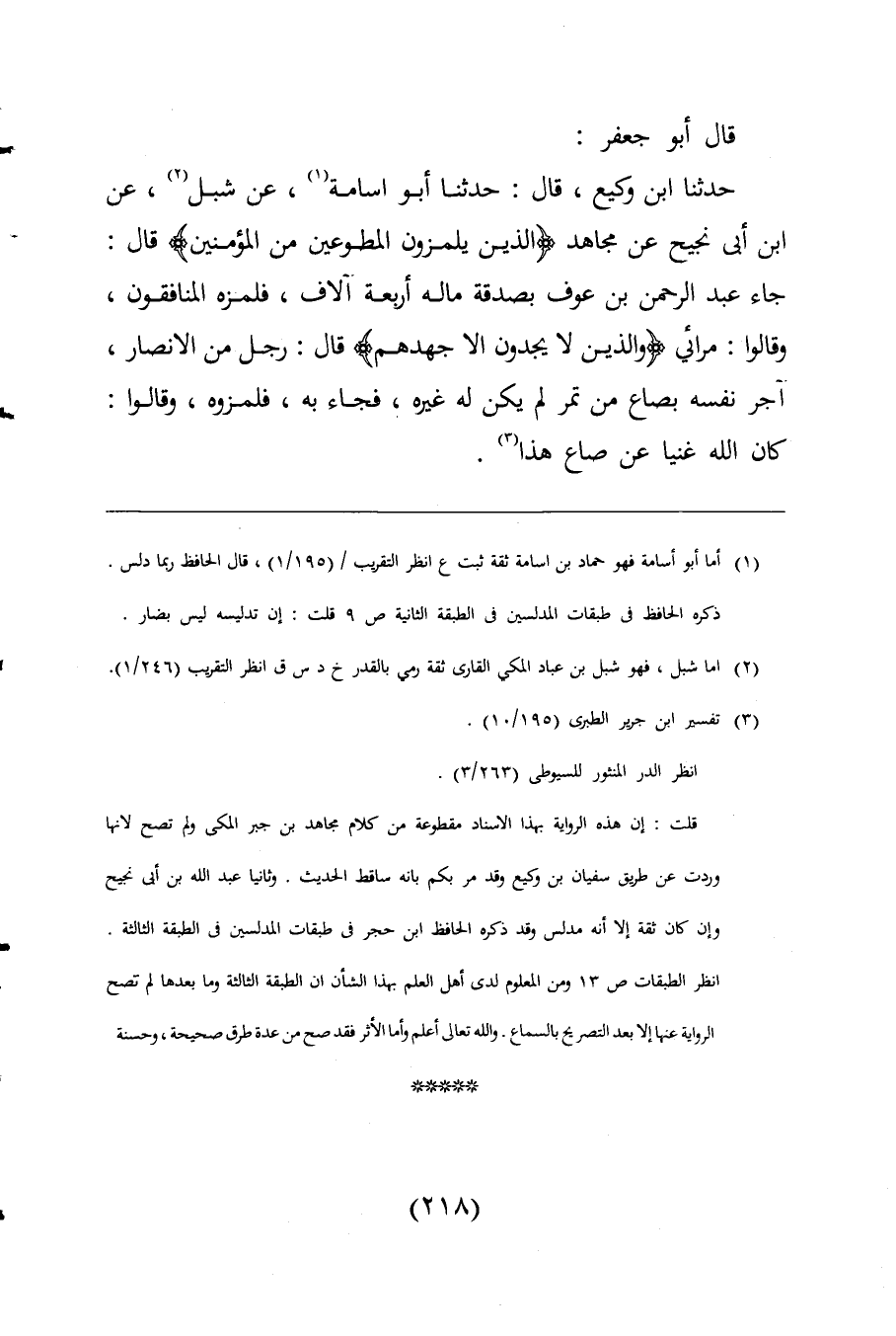قلت: إن هذه الرواية بهذا الاسناد مقطوعة من كلام مجاهد بن جبر المكى ولم تصح لانها وردت عن طريق سفيان بن وكيع وقد مر بكم بانه ساقط الحديث. وثانيا عبد اللَّه بن أبى نجيح وإن كان ثقة إلا أنه مدلس وقد ذكره الحافظ ابن حجر فى طبقات المدلسين فى الطبقة الثالثة. انظر الطبقات ص 13 ومن المعلوم لدى أهل العلم بهذا الشأن ان الطبقة الثالثة وما بعدها لم تصح الرواية عنها إلا بعد التصريح بالسماع. واللَّه تعالى أعلم وأما الأثر فقد صح من عدة طرق صحيحة، وحسنة
