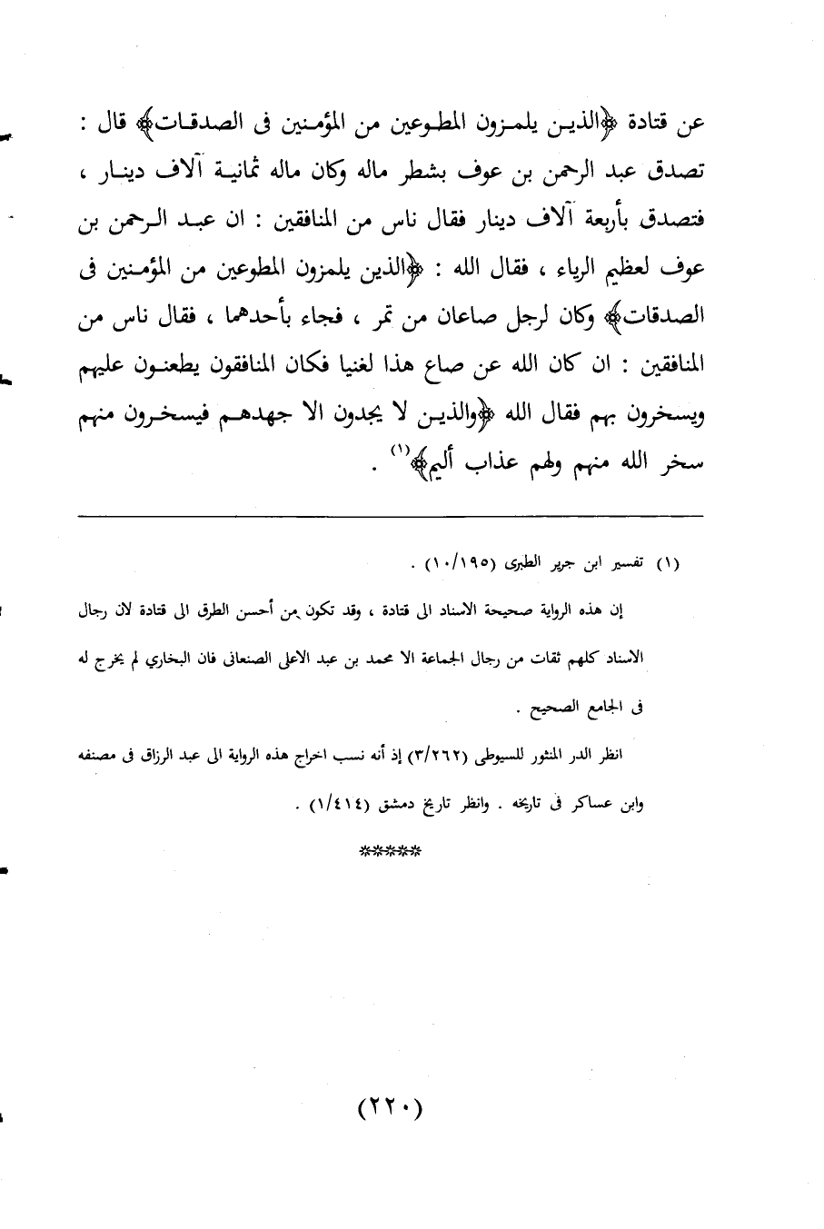 عن قتادة {الَّذِينَ يَلْمِزُونَ الْمُطَّوِّعِينَ مِنَ الْمُؤْمِنِينَ فِي الصَّدَقَاتِ} قال: تصدق عبد الرحمن بن عوف بشطر ماله وكان ماله ثمانية آلاف دينار، فتصدف بأربعة آلاف دينار فقال ناس من المنافقين: ان عبد الرحمن بن عوف لعظيم الرياء، فقال اللَّه: {الَّذِينَ يَلْمِزُونَ الْمُطَّوِّعِينَ مِنَ الْمُؤْمِنِينَ فِي الصَّدَقَاتِ} وكان لرجل صاعان من تمر، فجاء بأحدهما، فقال ناس من المنافقين: ان كان اللَّه عن صاع هذا لغنيا فكان المنافقون يطعنون عليهم ويسخرون بهم فقال اللَّه {وَالَّذِينَ لَا يَجِدُونَ إِلَّا جُهْدَهُمْ فَيَسْخَرُونَ مِنْهُمْ سَخِرَ اللَّهُ مِنْهُمْ وَلَهُمْ عَذَابٌ أَلِيمٌ} (¬1).