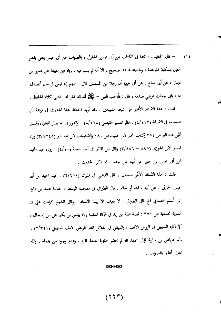 قلت: هذا الاسناد الآخر ضعيف، قال الذهبي فى الميزان (651/ 2): عبد المجيد بن أبى عبس الحارثي، عن أبيه، لينه أو حاتم. قال الطبرانى فى معجمه الوسط: حدثنا محمد بن داود ابن أسلم الصدفي الخ قال الطبرانى: لا يعرف الا بهذا الاسناد. وقال الشيخ كرامت على فى السيرة المحمدية ص 371: قصة علبة بن زيد فى الزكاة المتقبلة رواه يونس بن بكر عن ابن إسحاق، كما ذكره السهيلى فى الروض الانف، والبيهقى فى الدلائل انظر الروض الانف للسهيلى (321/ 2). وأما عرباض بن سارية فإنى اعتقد انه لم يحضر الغزوة لشدة فقره، وعدم وجود من يحمله، واللَّه تعالى أعلم بالصواب.