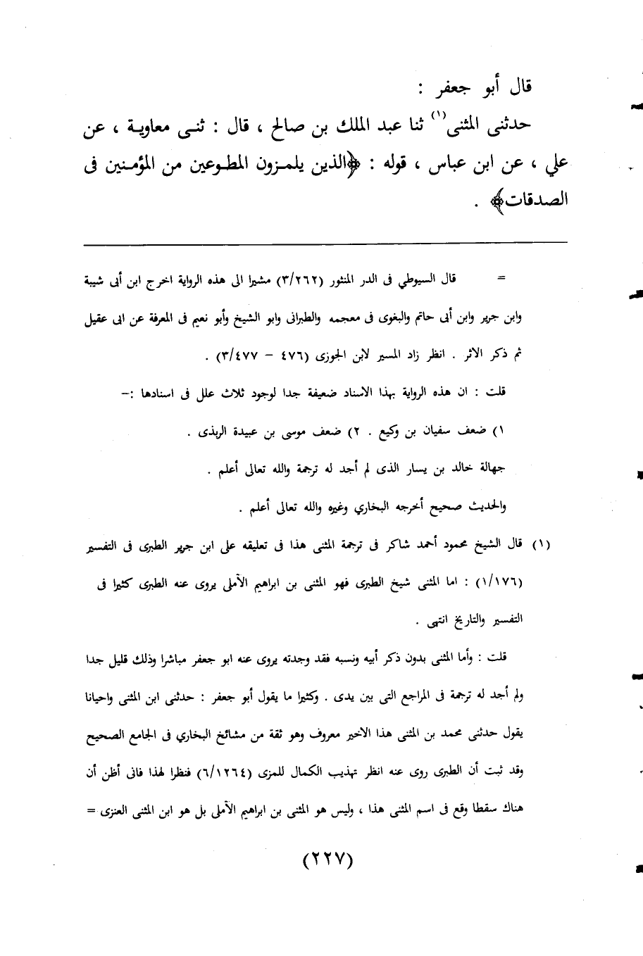 (¬1) قال الشيخ محمود أحمد شاكر فى ترجمة المثنى هذا فى تعليقه على ابن جرير الطبرى فى التفسير (176/ 1): اما المثنى شيخ الطبرى فهو المثنى بن إبراهيم الآملى يروى عنه الطبرى كثيرا فى التفسير والتاريخ انتهى.