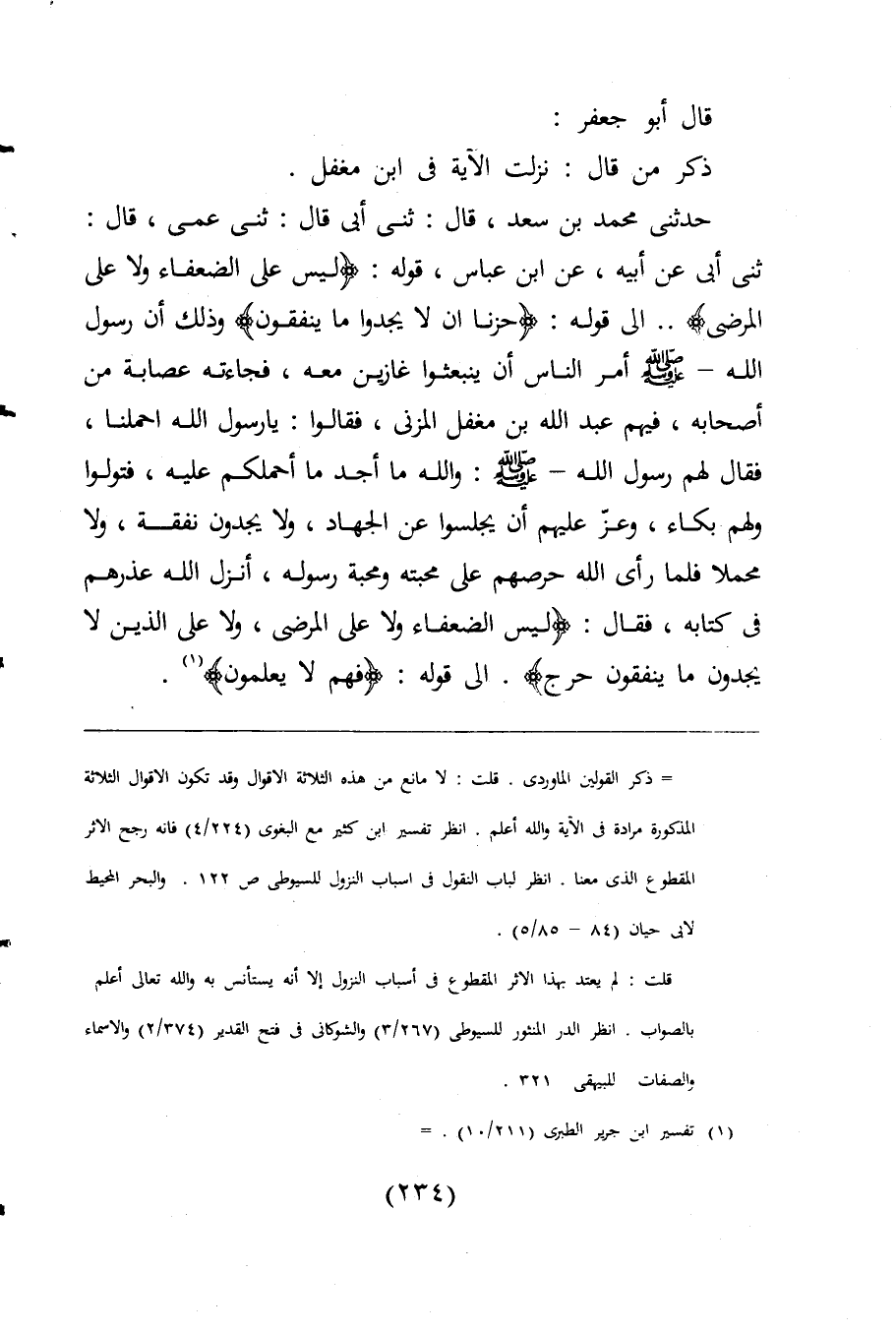 حدثنى محمد بن سعد، قال: ثنى أبى قال: ثنى عمى، قال: ثنى أبى عن أبيه، عن ابن عباس، قوله: {لَيْسَ عَلَى الضُّعَفَاءِ وَلَا عَلَى الْمَرْضَى}. . الى قوله: {حَزَنًا أَلَّا يَجِدُوا مَا يُنْفِقُونَ} وذلك أن رسول اللَّه -صلى اللَّه عليه وسلم- أمر الناس أن ينبعثوا غازين معه، فجاءته عصابة من أصحابه، فيهم عبد اللَّه بن مغفل المزنى، فقالوا: يا رسول اللَّه احملنا، فقال لهم رسول اللَّه -صلى اللَّه عليه وسلم-: واللَّه ما أجد ما أحملكم عليه، فتولوا ولهم بكاء، وعزّ عليهم أن يجلسوا عن الجهاد، ولا يجدون نفقة، ولا محملا فلما رأى اللَّه حرصهم على محبته ومحبة رسوله، أنزل اللَّه عذرهم فى كتابه، فقال: {لَيْسَ عَلَى الضُّعَفَاءِ وَلَا عَلَى الْمَرْضَى وَلَا عَلَى الَّذِينَ لَا يَجِدُونَ مَا يُنْفِقُونَ حَرَجٌ}. الى قوله: {فَهُمْ لَا يَعْلَمُونَ} (¬1).
