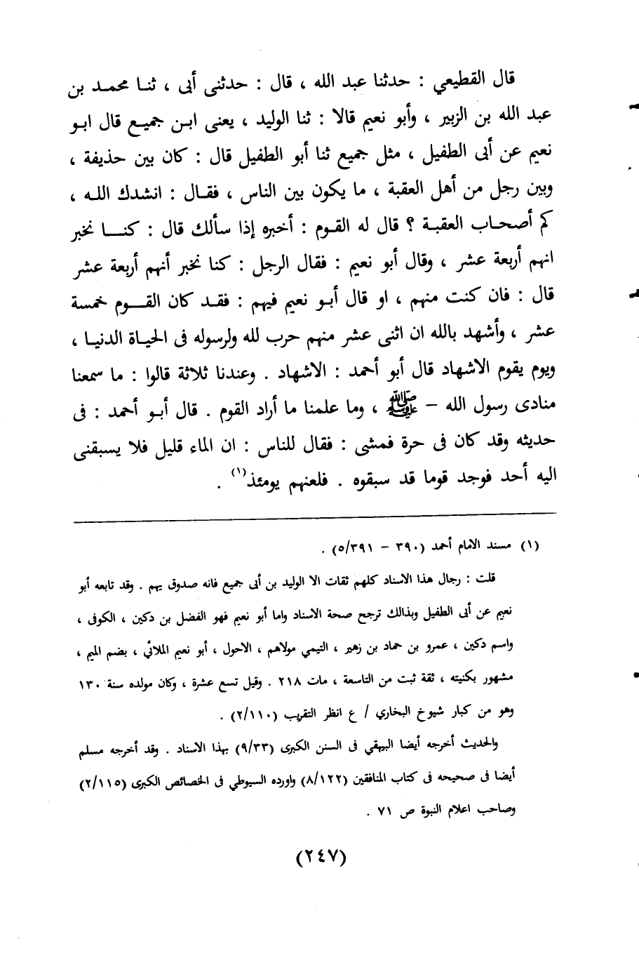 قال القطيعي: حدثنا عبد اللَّه، قال: حدثنى أبى، ثنا محمد بن عبد اللَّه بن الزبير، وأبو نعيم قالا: ثنا الوليد، يعنى ابن جميع قال أبو نعيم عن أبى الطفيل، مثل جميع ثنا أبو الطفيل قال: كان بين حذيفة، وبين رجل من أهل العقبة، ما يكون بين الناس، فقال: انشدك اللَّه، كم أصحاب العقبة؟ قال له القوم: أخبره إذا سألك قال: كنا نخبر انهم أربعة عشر، وقال أبو نعيم: فقال الرجل: كنا نخبر أنهم أربعة عشر قال: فان كنت منهم، أو قال أبو نعيم فيهم: فقد كان القوم خمسة عشر، وأشهد باللَّه ان اثنى عشر منهم حرب للَّه ولرسوله فى الحياة الدنيا، ويوم يقوم الاشهاد قال أبو أحمد: الاشهاد. وعندنا ثلاثة قالوا: ما سمعنا منادى رسول اللَّه -صلى اللَّه عليه وسلم-، وما علمنا ما أراد القوم. قال أبو أحمد: فى حديثه وقد كان فى حرة فمشى: فقال للناس: ان الماء قليل فلا يسبقنى اليه أحد فوجد قوما قد سبقوه. فلعنهم يومئذ (¬1).
