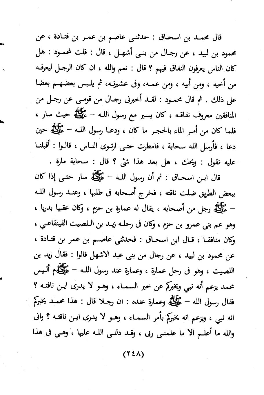 قال محمد بن إسحاق: حدثنى عاصم بن عمر بن قتادة، عن محمود بن لبيد، عن رجال من بنى أشهل، قال: قلت لمحمود: هل كان الناس يعرفون النفاق فيهم؟ قال: نعم واللَّه، ان كان الرجل ليعرفه من أخيه، ومن أبيه، ومن عمه، وفى عشيرته، ثم يلبس بعضهم بعضا على ذلك. ثم قال محمود: لقد أخبرنى رجال من قومى عن رجل من المنافقين معروف نفاقه، كان يسير مع رسول اللَّه -صلى اللَّه عليه وسلم- حيث سار، فلما كان من أمر الماء بالحجر ما كان، ودعا رسول اللَّه -صلى اللَّه عليه وسلم- حين دعا، فأرسل اللَّه سحابة، فامطرت حتى ارتوى الناس، قالوا: أقبلنا عليه نقول: ويحك، هل بعد هذا شيء؟ قال: سحابة مارة.