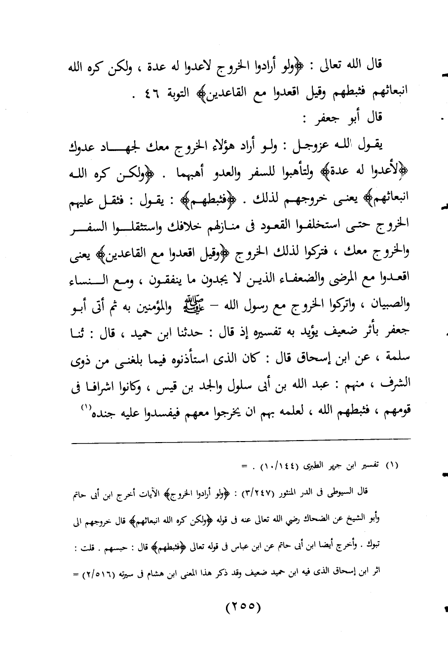قال السيوطى فى الدر المنثور (247/ 3): {وَلَوْ أَرَادُوا الْخُرُوجَ} الآيات أخرج ابن أبى حاتم وأبو الشيخ عن الضحاك رضي اللَّه تعالى عنه فى قوله {وَلَكِنْ كَرِهَ اللَّهُ انْبِعَاثَهُمْ} قال خروجهم الى تبوك. وأخرج أيضا ابن أبى حاتم عن ابن عباس فى قوله تعالى {فَثَبَّطَهُمْ} قال: حبسهم. قلت: أثر ابن إسحاق الذى فيه ابن حميد ضعيف وقد ذكر هذا المعنى ابن هشام فى سيرته (516/ 2) =
