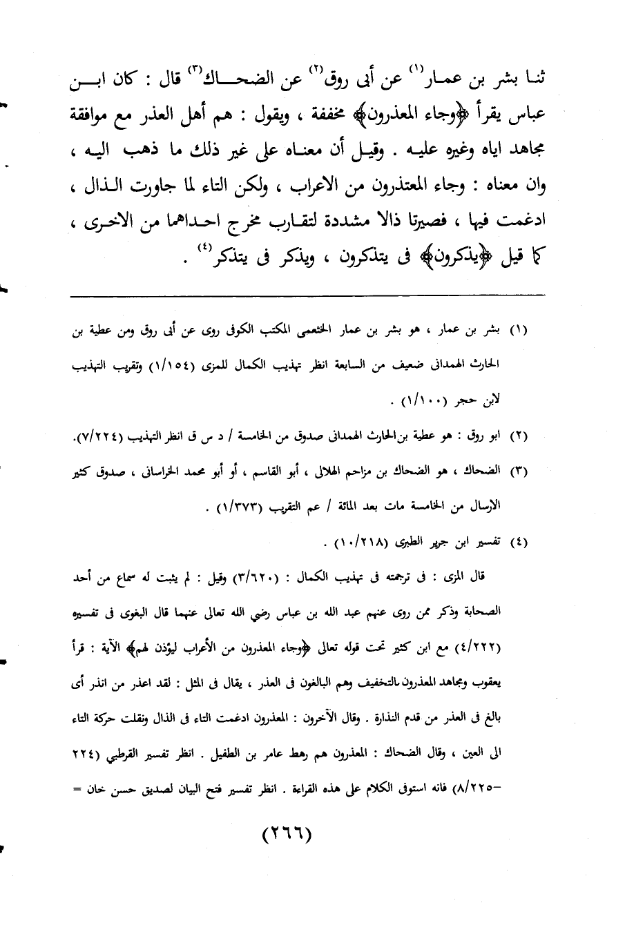 ثنا بشر بن عمار (¬1) عن أبى روق (¬2) عن الضحاك (¬3) قال: كان ابن عباس يقرأ {وَجَاءَ الْمُعَذِّرُونَ} مخففة، ويقول: هم أهل العذر مع موافقة مجاهد إياه وغيره عليه. وقيل أن معناه على غير ذلك ما ذهب إليه، وأن معناه: وجاء المعتذرون من الأعراب، ولكن التاء لما جاورت الذال، ادغمت فيها، فصيرتا ذالا مشددة لتقارب مخرج إحداهما من الأخرى، كما قيل {يذكرون} فى يتذكرون، ويذكر فى يتذكر (¬4).