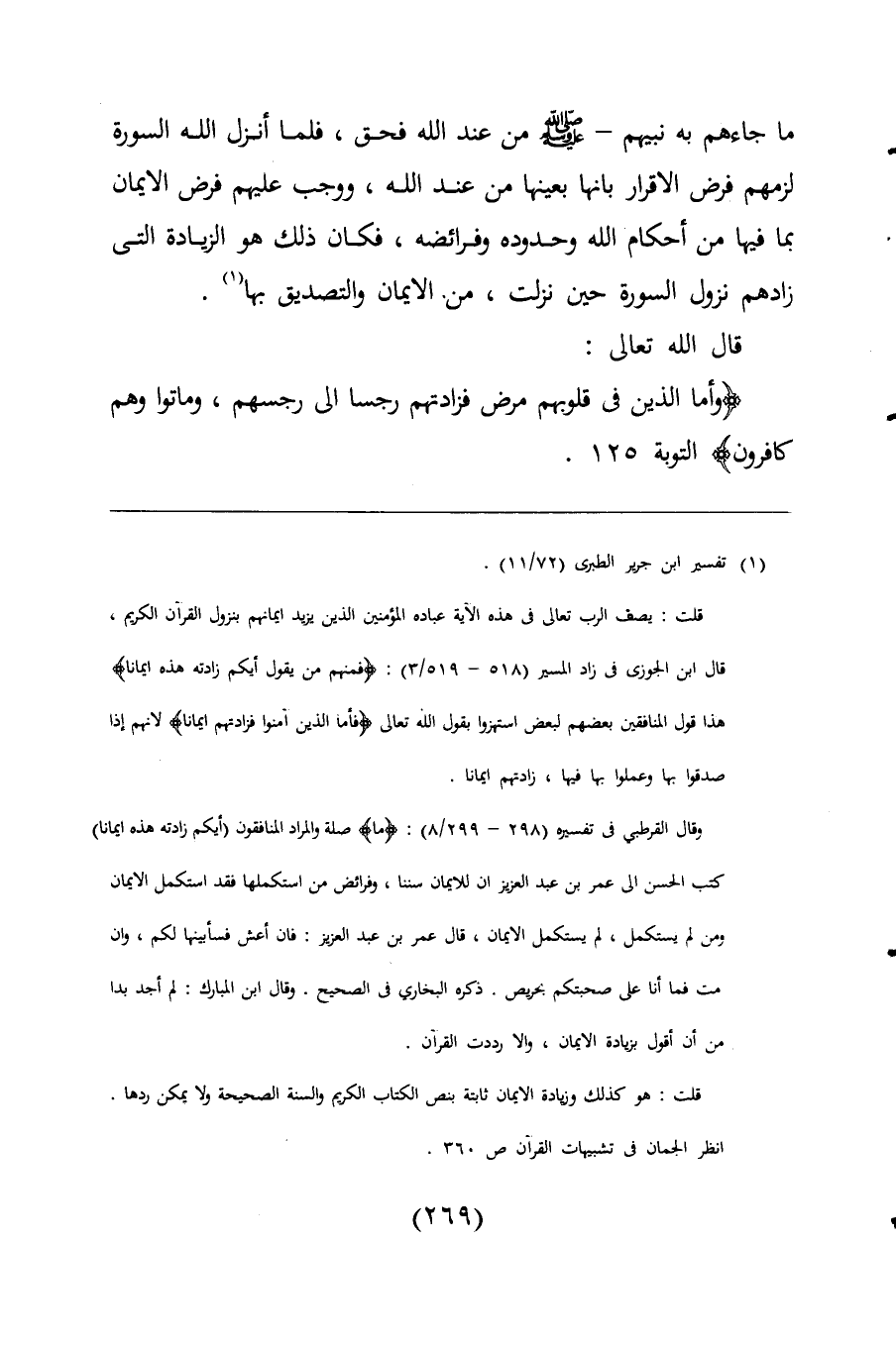 قلت: هو كذلك وزيادة الإيمان ثابتة بنص الكتاب الكريم والسنة الصحيحة ولا يمكن ردها. انظر الجمان فى تشبيهات القرآن ص 360.