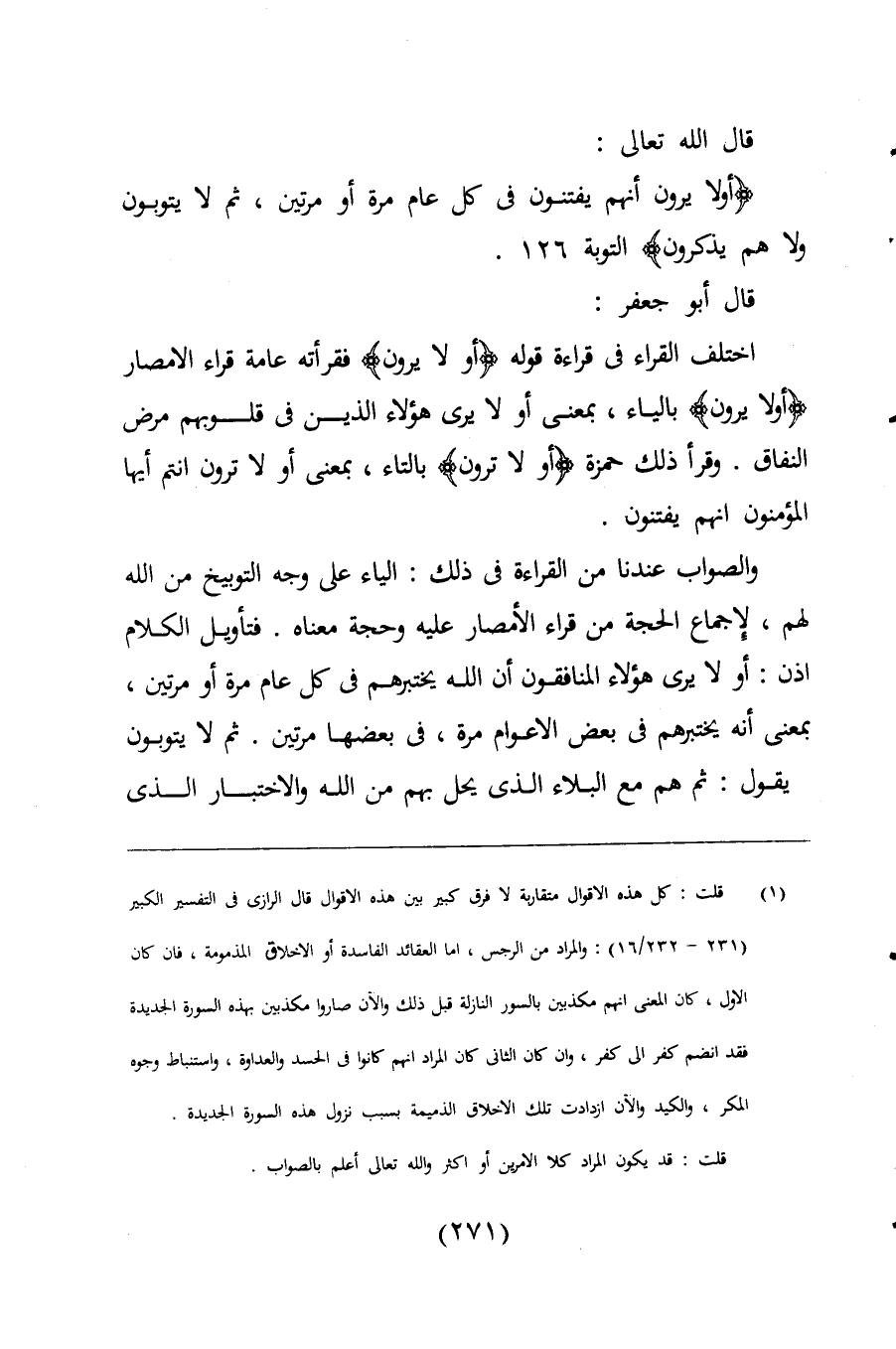 والصواب عندنا من القراءة فى ذلك: الياء على وجه التوبيخ من اللَّه لهم، لإجماع الحجة من قراء الأمصار عليه وحجة معناه. فتأويل الكلام إذن: أو لا يرى هؤلاء المنافقون أن اللَّه يختبرهم فى كل عام مرة أو مرتين، بمعنى أنه يختبرهم فى بعض الأعوام مرة، فى بعضها مرتين. ثم لا يتوبون يقول: ثم هم مع البلاء الذى يحل بهم من اللَّه والإختبار الذى