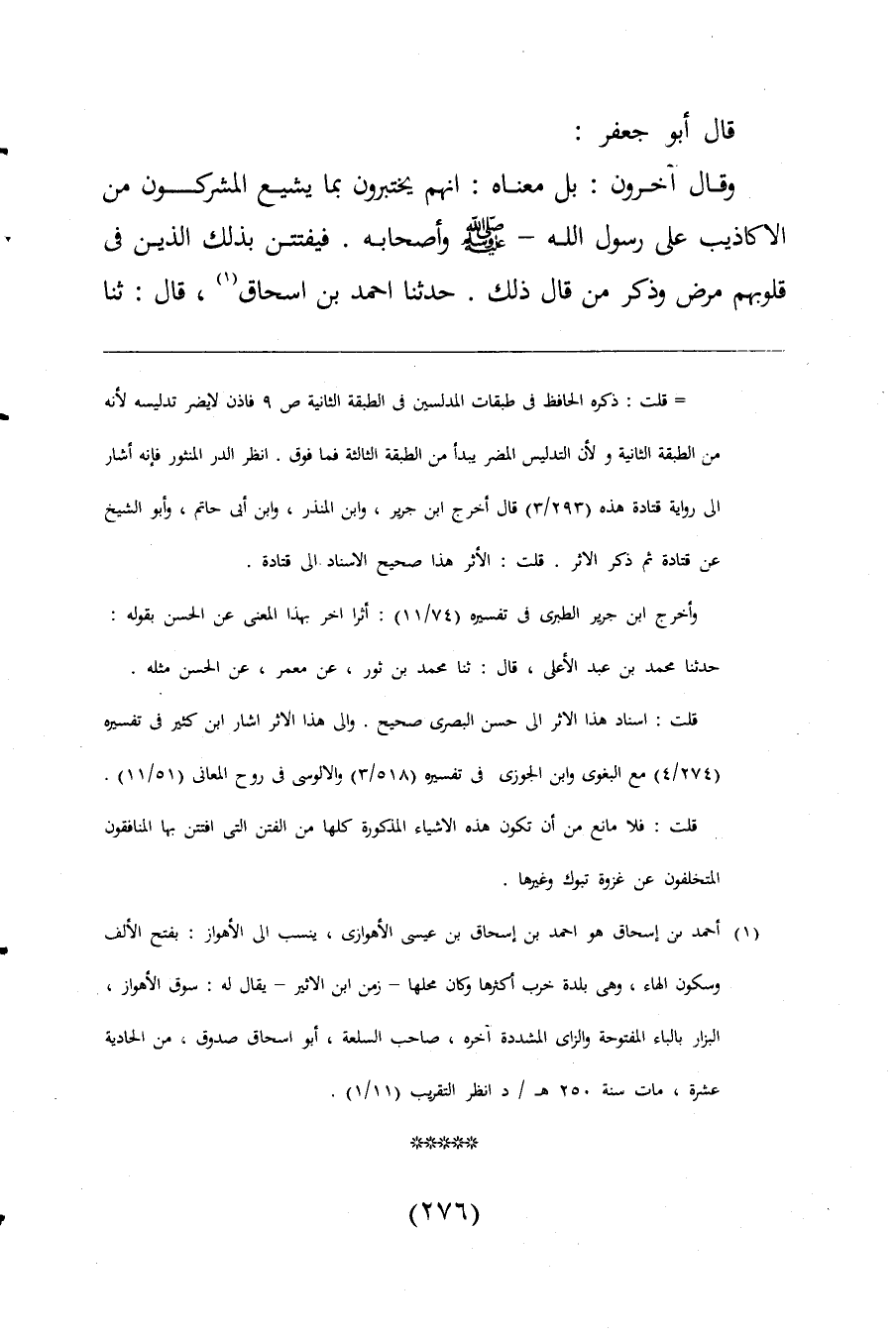 = قلت: ذكره الحافظ فى طبقات المدلسين فى الطبقة الثانية ص 9 فإذن لا يضر تدليسه لأنه من الطبقة الثانية ولأن التدليس المضر يبدأ من الطبقة الثالثة فما فوق. انظر الدر المنثور فإنه أشار الى رواية قتادة هذه (293/ 3) قال أخرج ابن جرير، وابن المنذر، وابن أبى حاتم، وأبو الشيخ عن قتادة ثم ذكر الأثر. قلت: الأثر هذا صحيح الاسناد، الى قتادة.